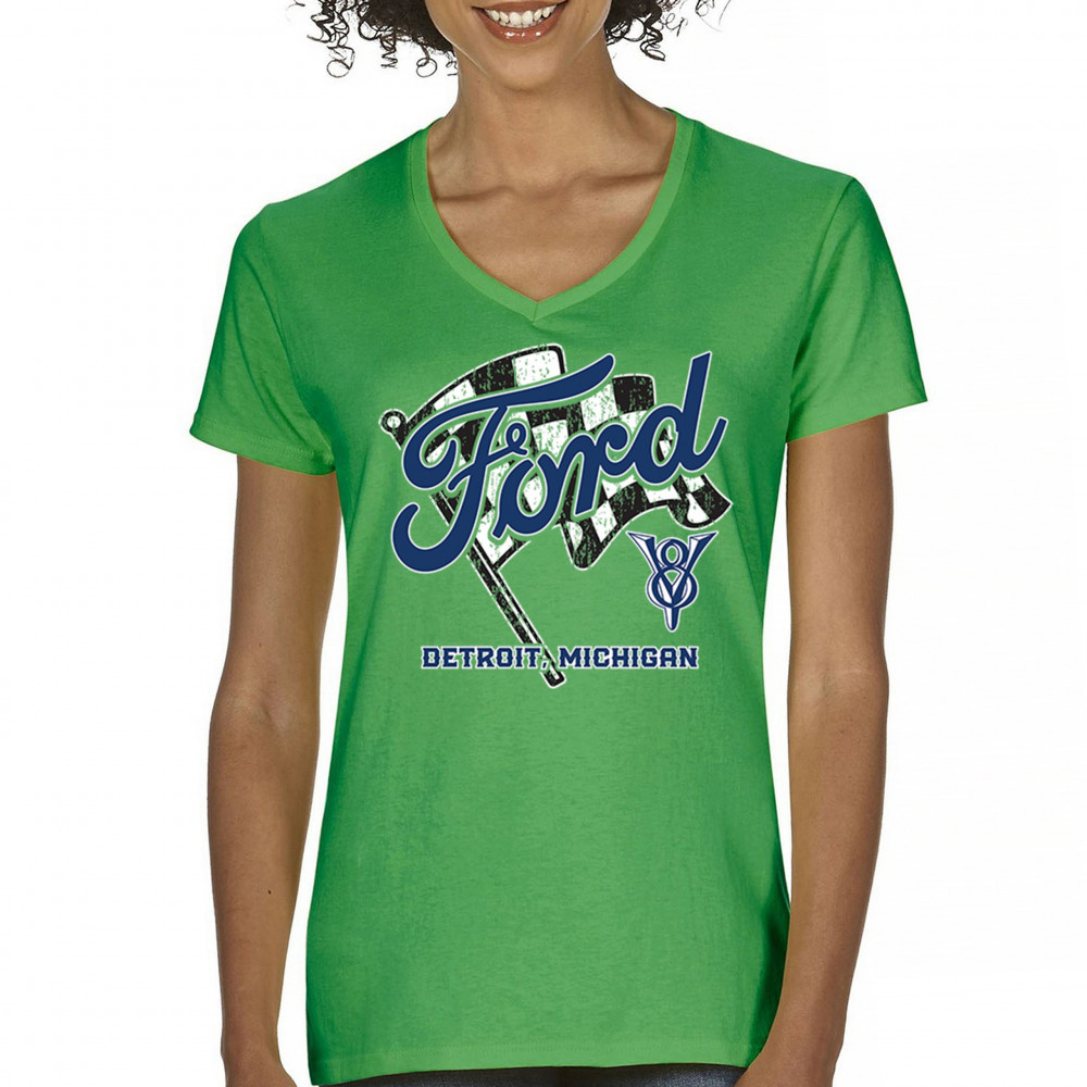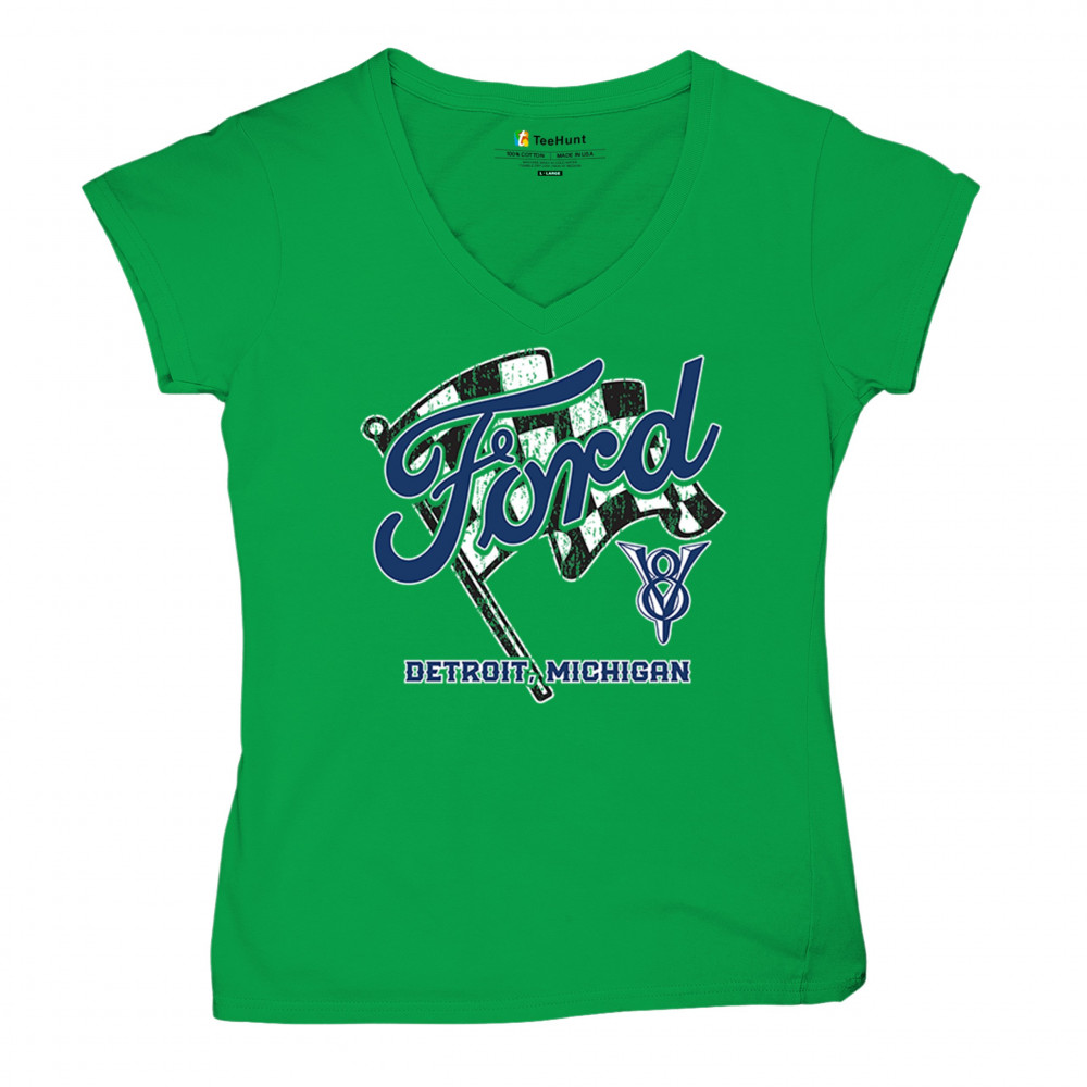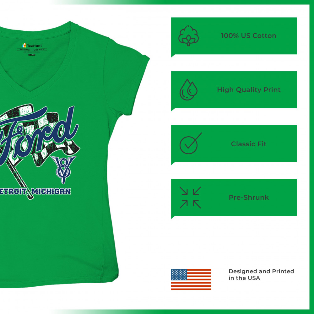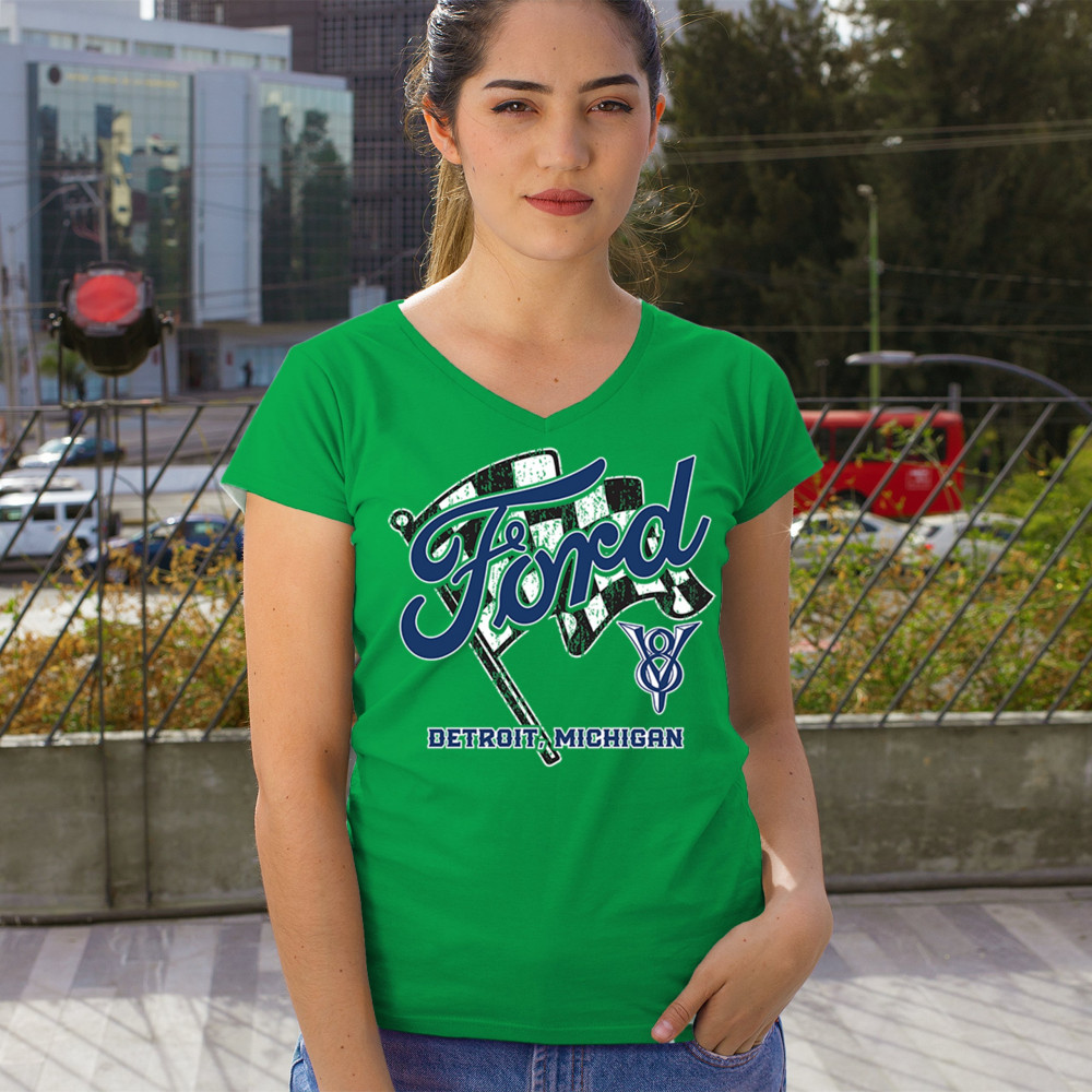 Honor Detroit, Michigan’s Ford legacy with this officially licensed design featuring a checkered flag and bold V8 emblem, perfect for muscle car fans and classic car lovers.