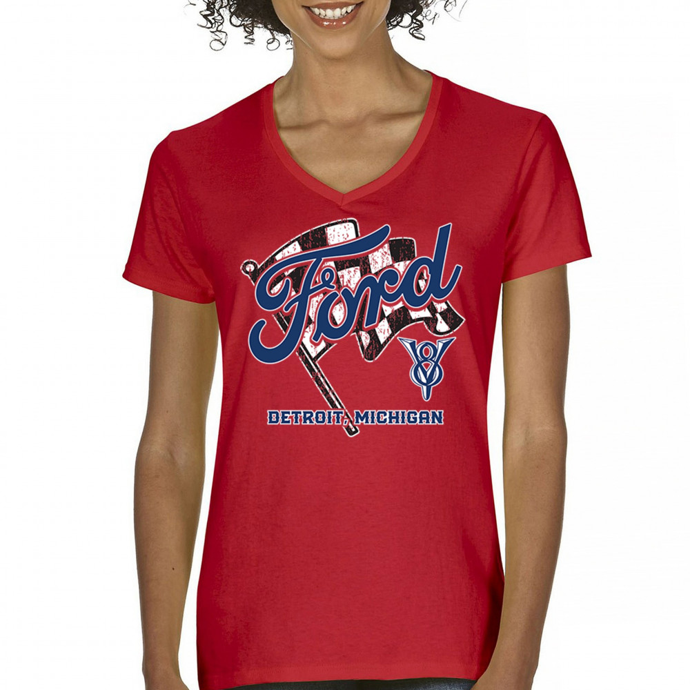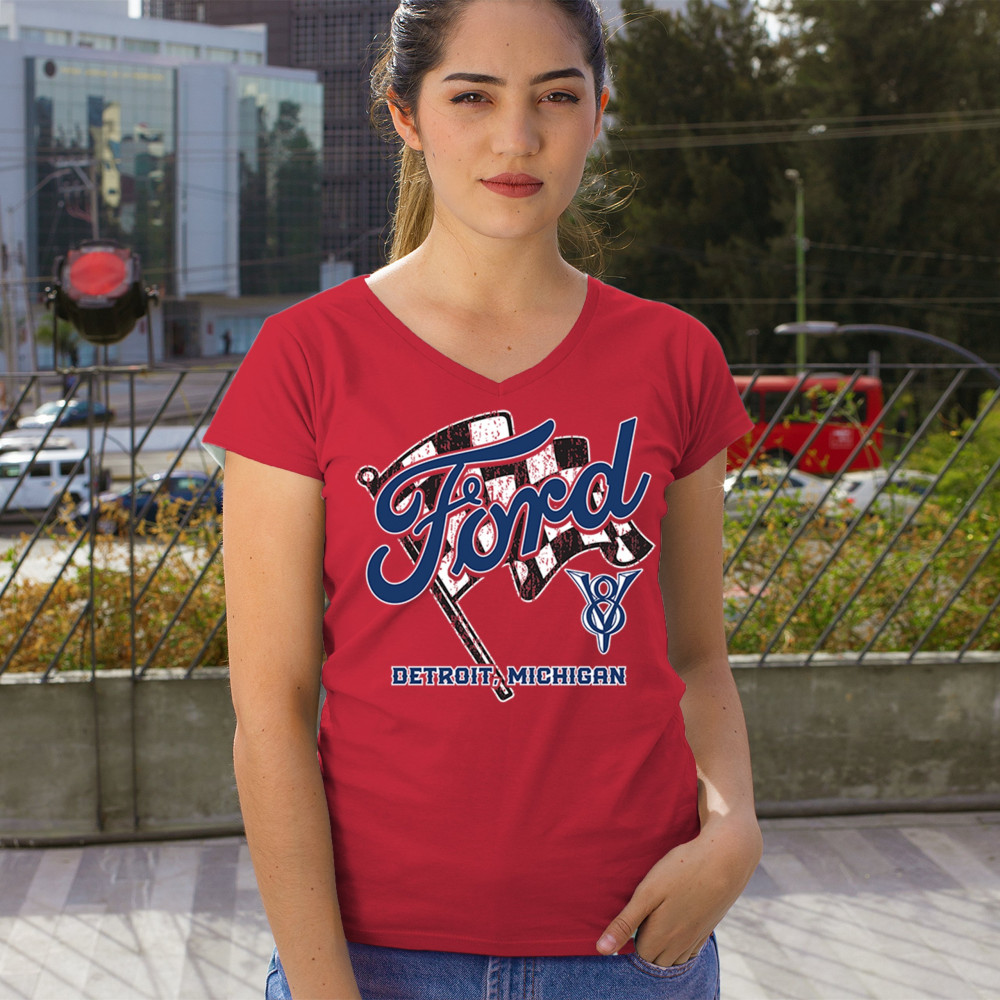 Honor Detroit, Michigan’s Ford legacy with this officially licensed design featuring a checkered flag and bold V8 emblem, perfect for muscle car fans and classic car lovers.