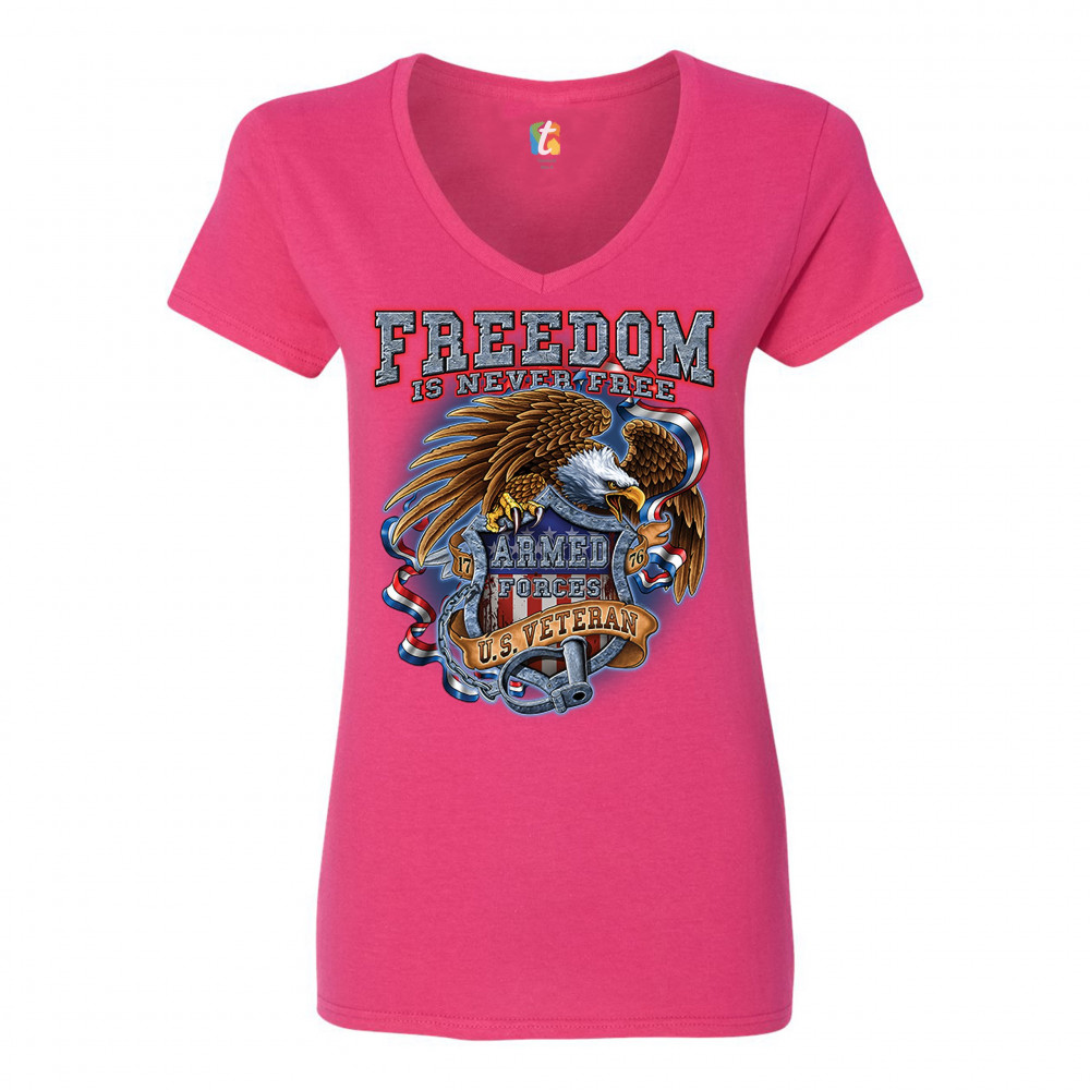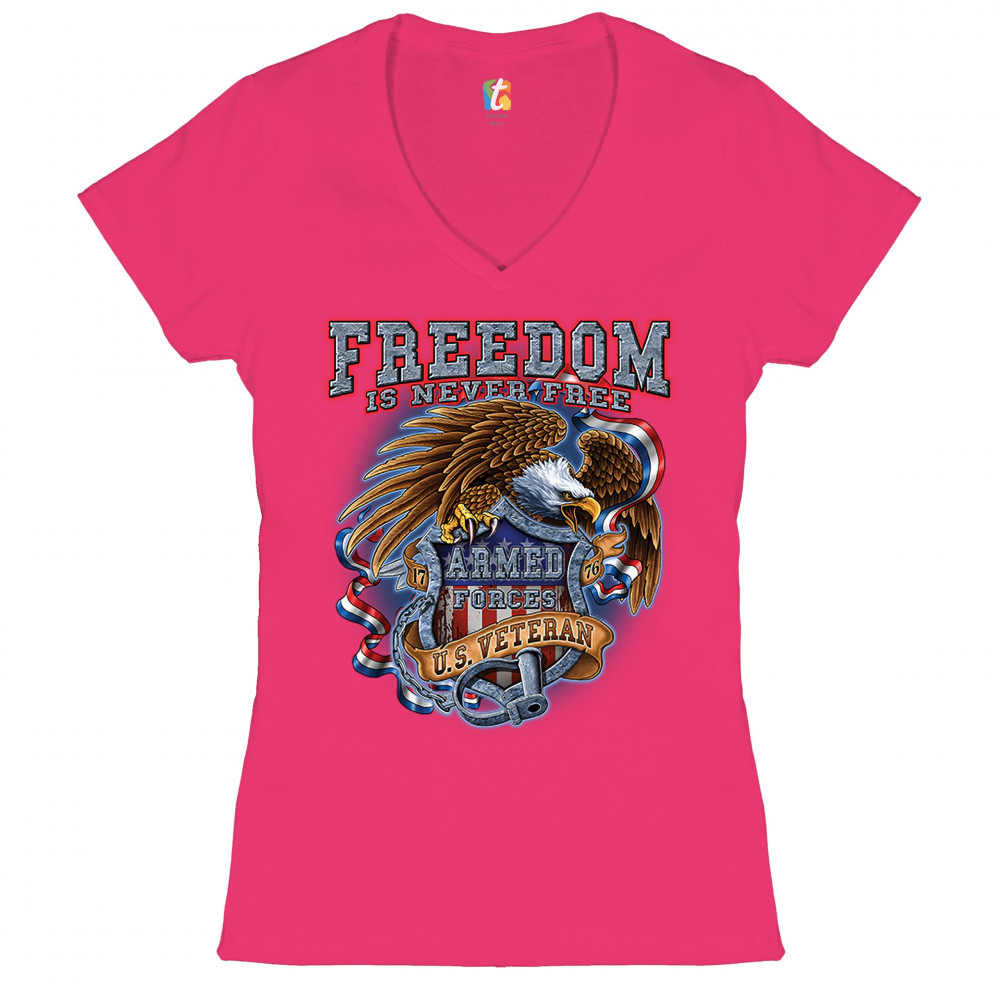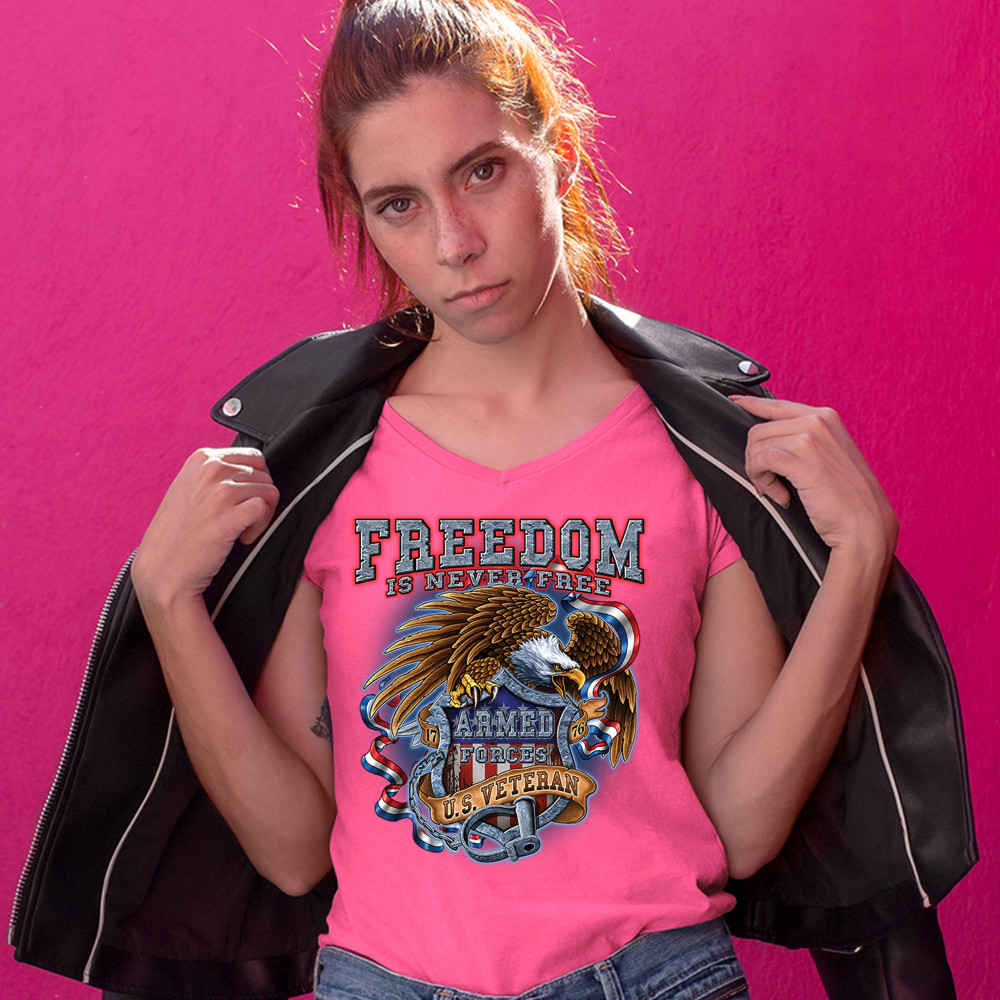 A patriotic print featuring a bald eagle holding a shield with an American Flag and "Armed Forces" written on it. The print says: "Freedom Is Never Free, 1776, U.S. Veteran". Great choice to wear on Independence Day or any other patriotic holiday.