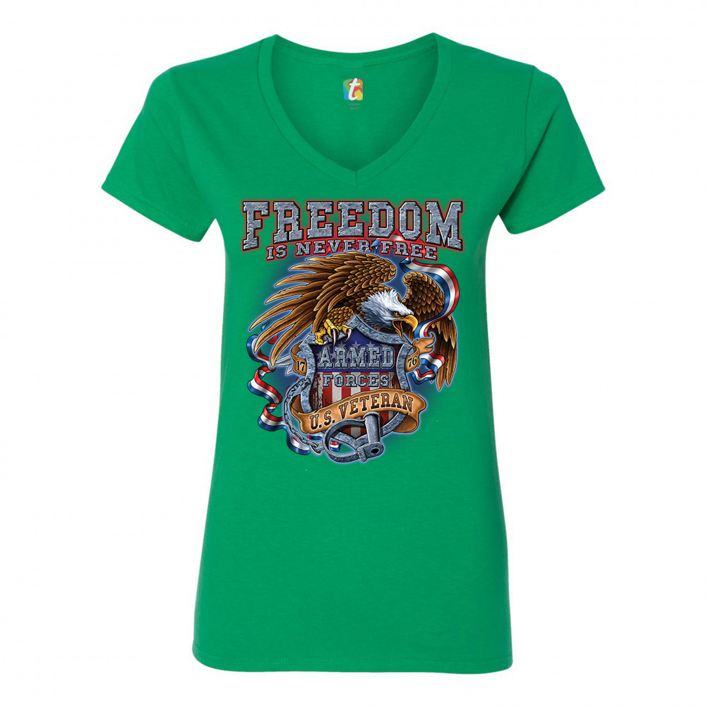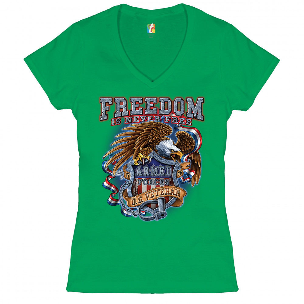 A patriotic print featuring a bald eagle holding a shield with an American Flag and "Armed Forces" written on it. The print says: "Freedom Is Never Free, 1776, U.S. Veteran". Great choice to wear on Independence Day or any other patriotic holiday.