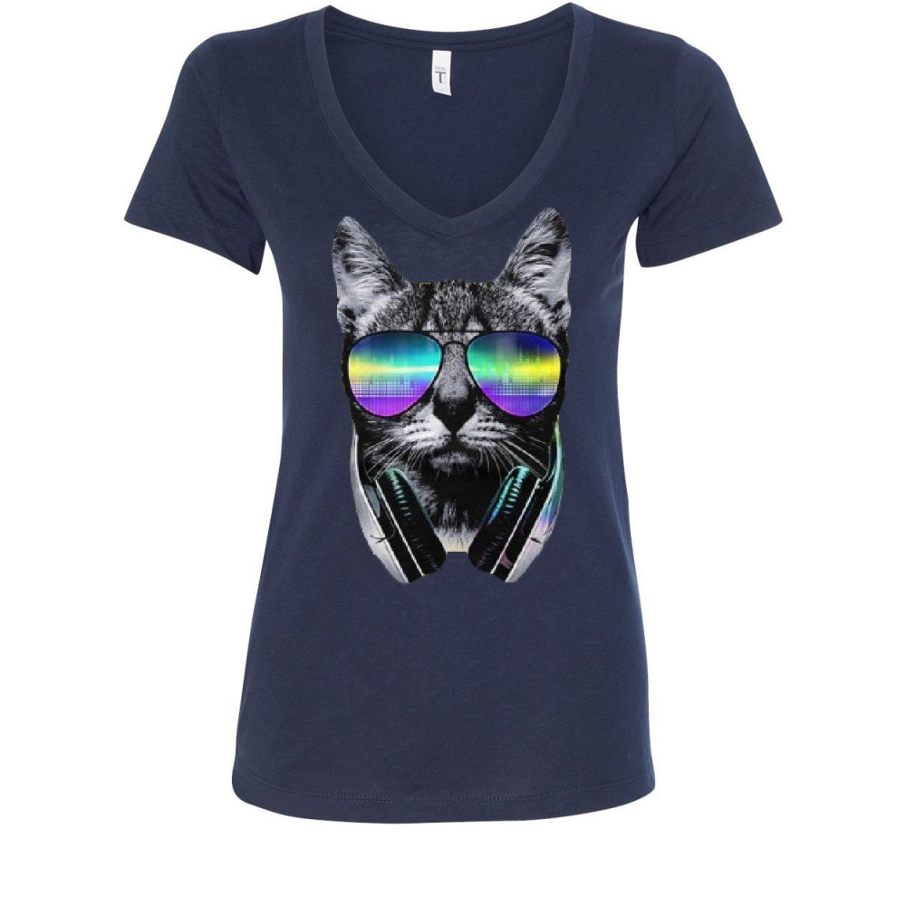FUNNY DJ CAT v-neck t-shirt music kitten headphones and glasses navy blue