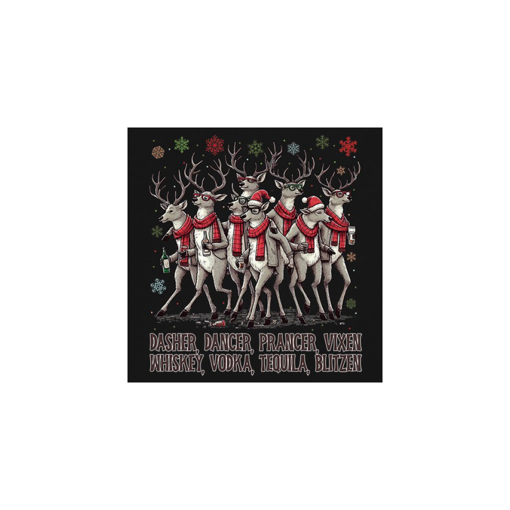 This funny holiday design features a squad of drinking reindeer carrying bottles and dressed in scarves for the ultimate Christmas party vibe. Great for bar crawls, office parties, winter gatherings, adult holiday events, white elephant exchanges, festive nights out, and anyone who loves spirited Christmas humor with a cheeky personality.