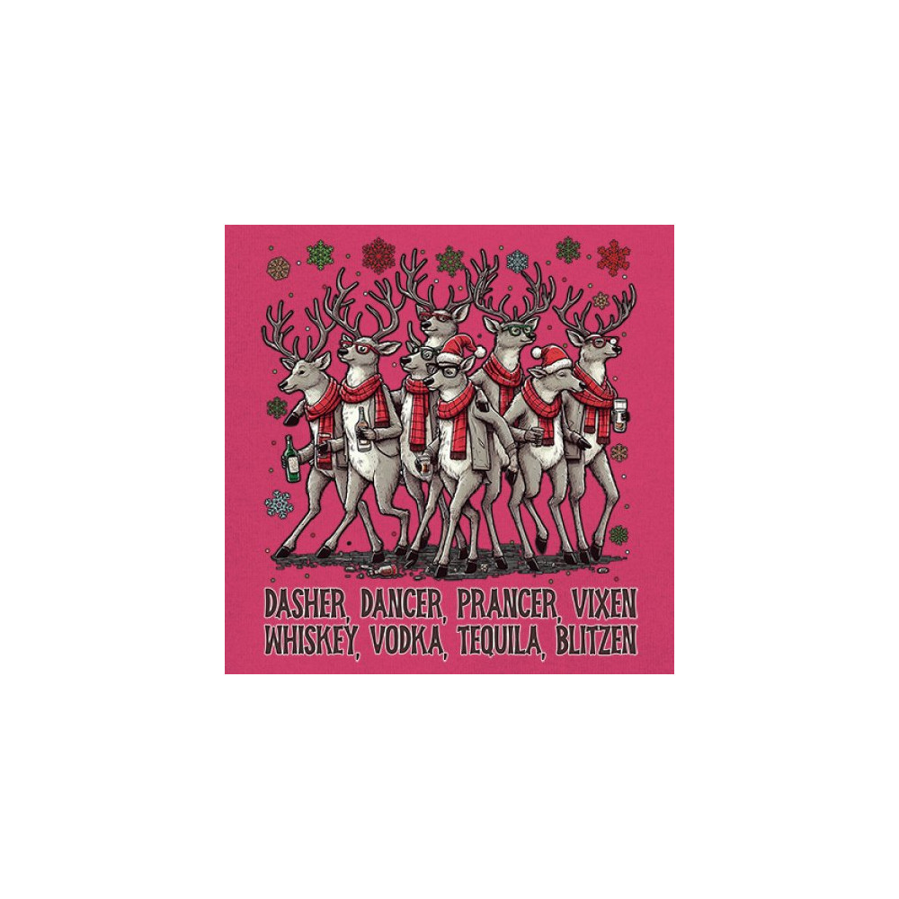 This funny holiday design features a squad of drinking reindeer carrying bottles and dressed in scarves for the ultimate Christmas party vibe. Great for bar crawls, office parties, winter gatherings, adult holiday events, white elephant exchanges, festive nights out, and anyone who loves spirited Christmas humor with a cheeky personality.