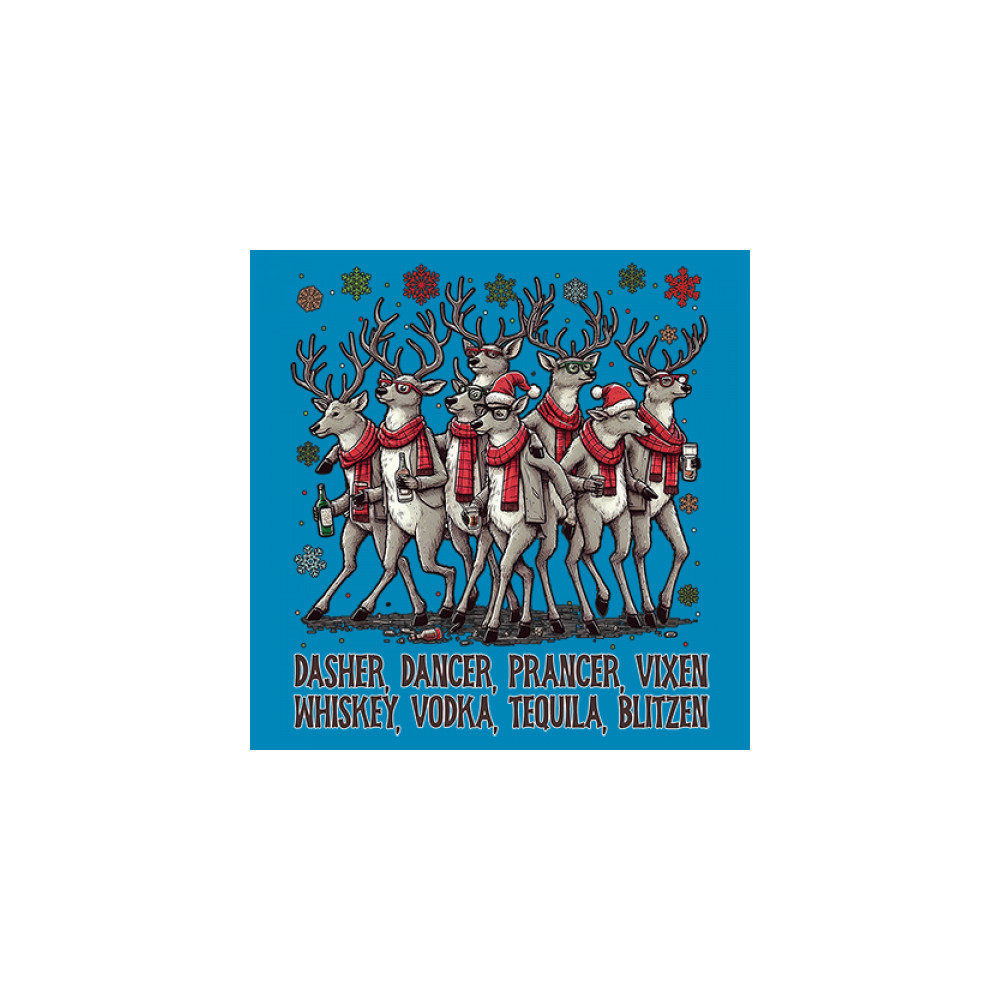 This funny holiday design features a squad of drinking reindeer carrying bottles and dressed in scarves for the ultimate Christmas party vibe. Great for bar crawls, office parties, winter gatherings, adult holiday events, white elephant exchanges, festive nights out, and anyone who loves spirited Christmas humor with a cheeky personality.