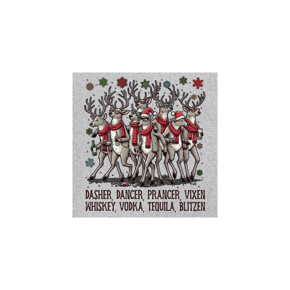 This funny holiday design features a squad of drinking reindeer carrying bottles and dressed in scarves for the ultimate Christmas party vibe. Great for bar crawls, office parties, winter gatherings, adult holiday events, white elephant exchanges, festive nights out, and anyone who loves spirited Christmas humor with a cheeky personality.