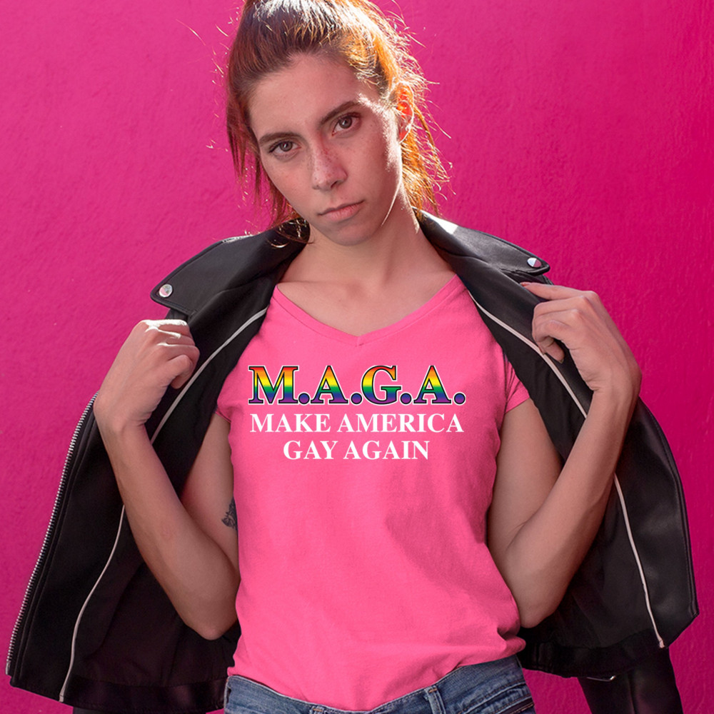 A funny print saying "M.A.G.A. Make America Gay Again". The acronym "M.A.G.A." is painted in the colors of lgbt rainbow. Wear it to show your support for the LGBTQ community.