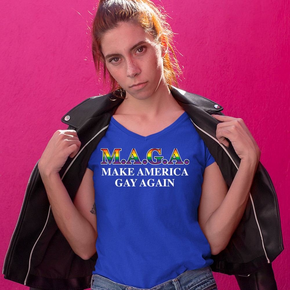 A funny print saying "M.A.G.A. Make America Gay Again". The acronym "M.A.G.A." is painted in the colors of lgbt rainbow. Wear it to show your support for the LGBTQ community.