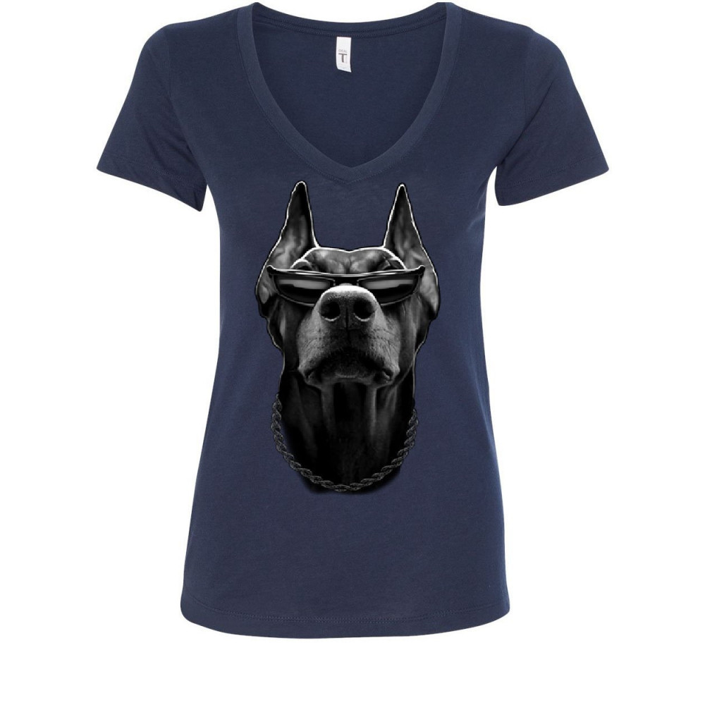 GANGSTA DOBERMAN WITH GLASSES women's v-neck t-shirt pet dog lovers swag badass navy blue