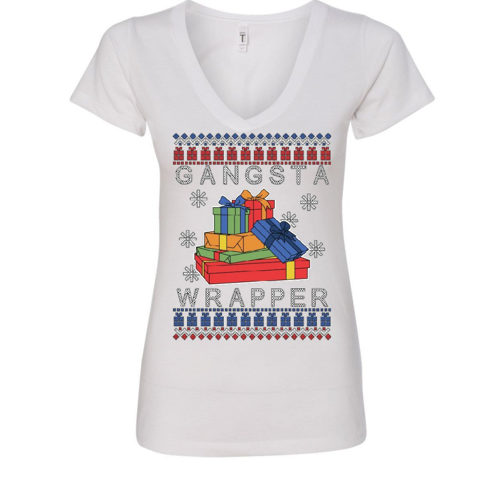 GANGSTA WRAPPER ugly sweater women's v-neck t-shirt merry jolly christmas xmas white