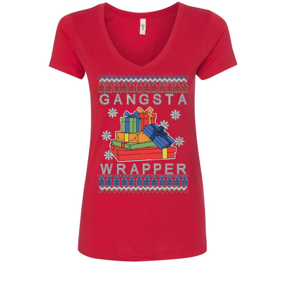 GANGSTA WRAPPER ugly sweater women's v-neck t-shirt merry jolly christmas xmas red