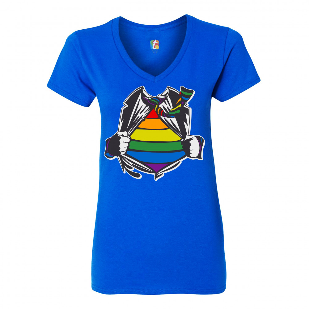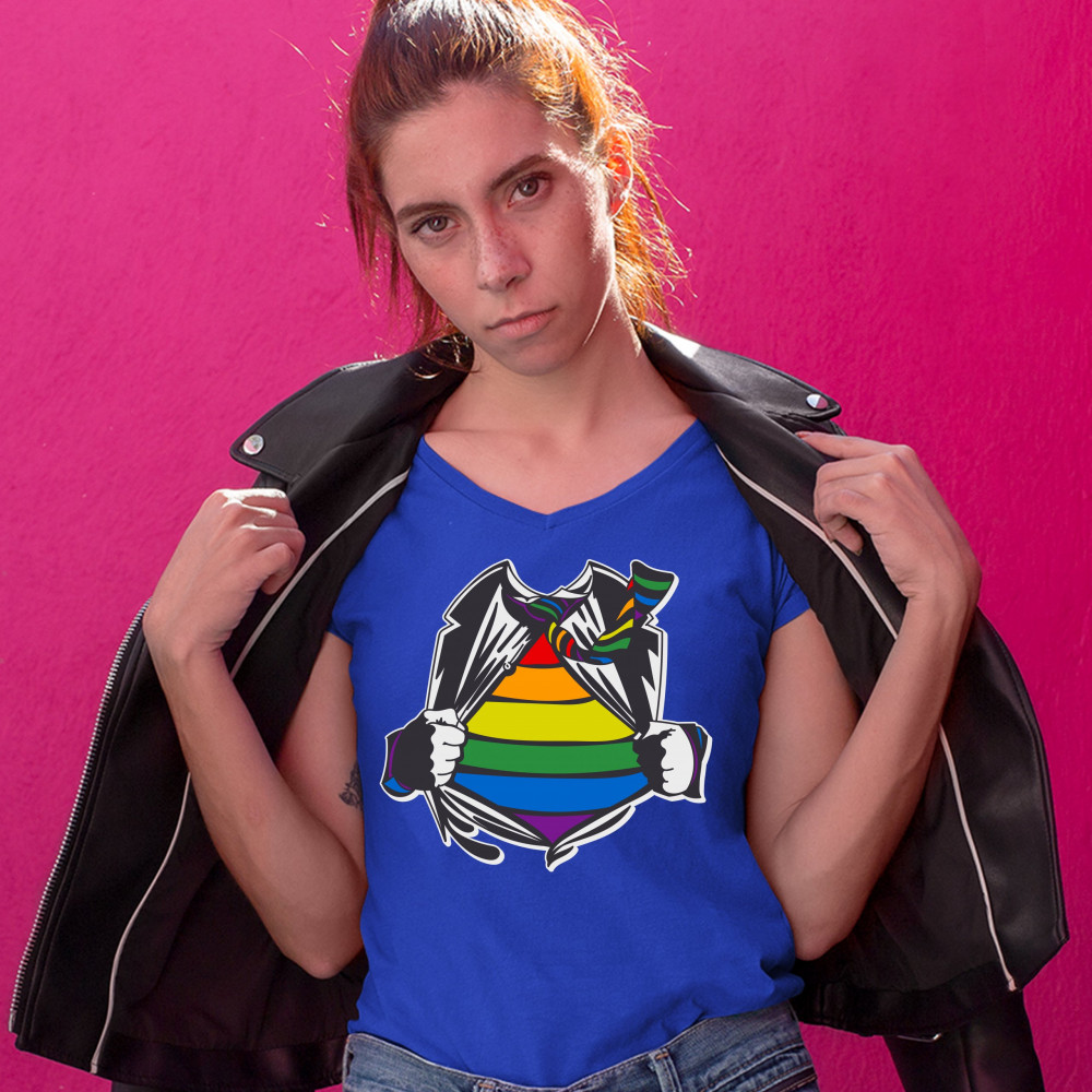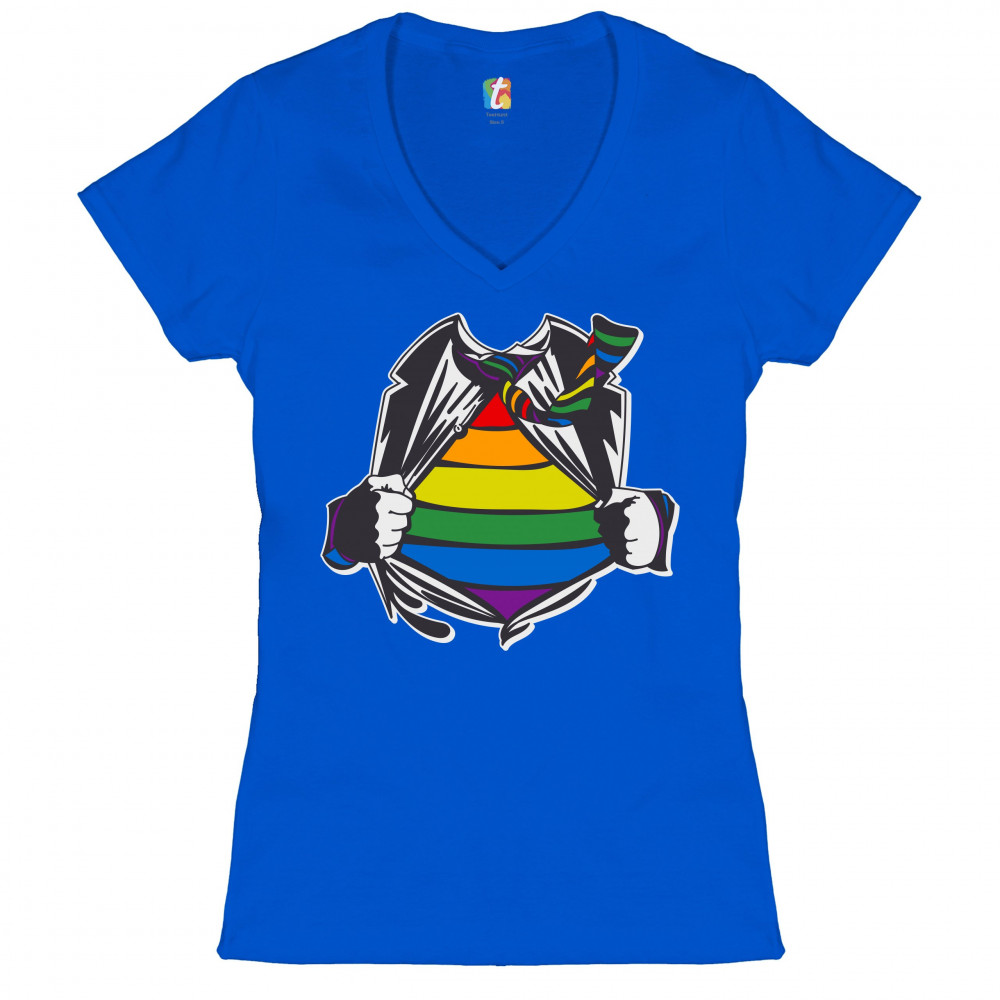 GAY SUPERHERO PARODY women's v-neck t-shirt lesbian bi transgender rainbow tee royal blue