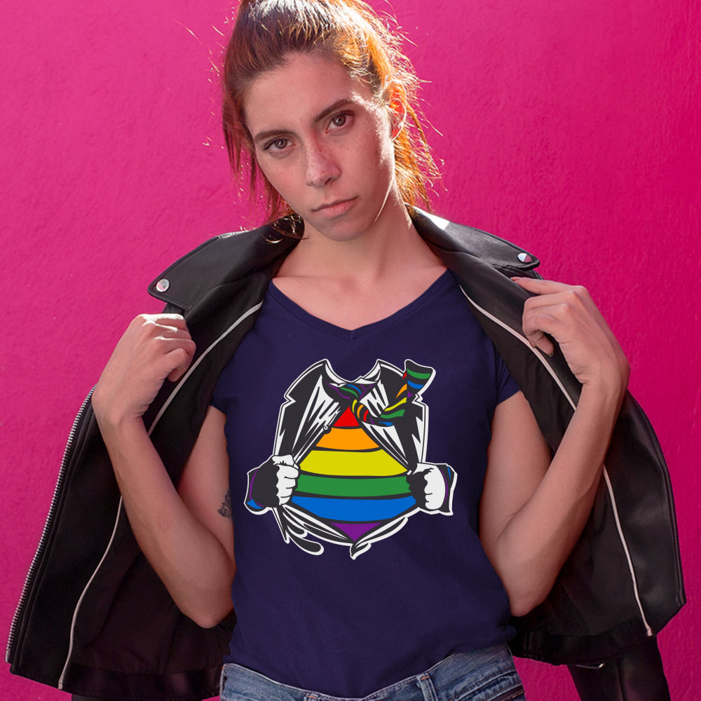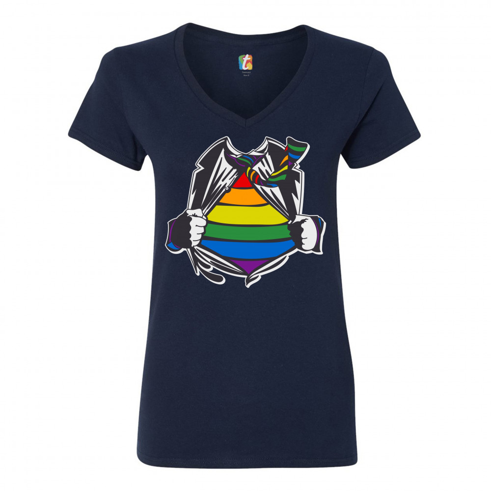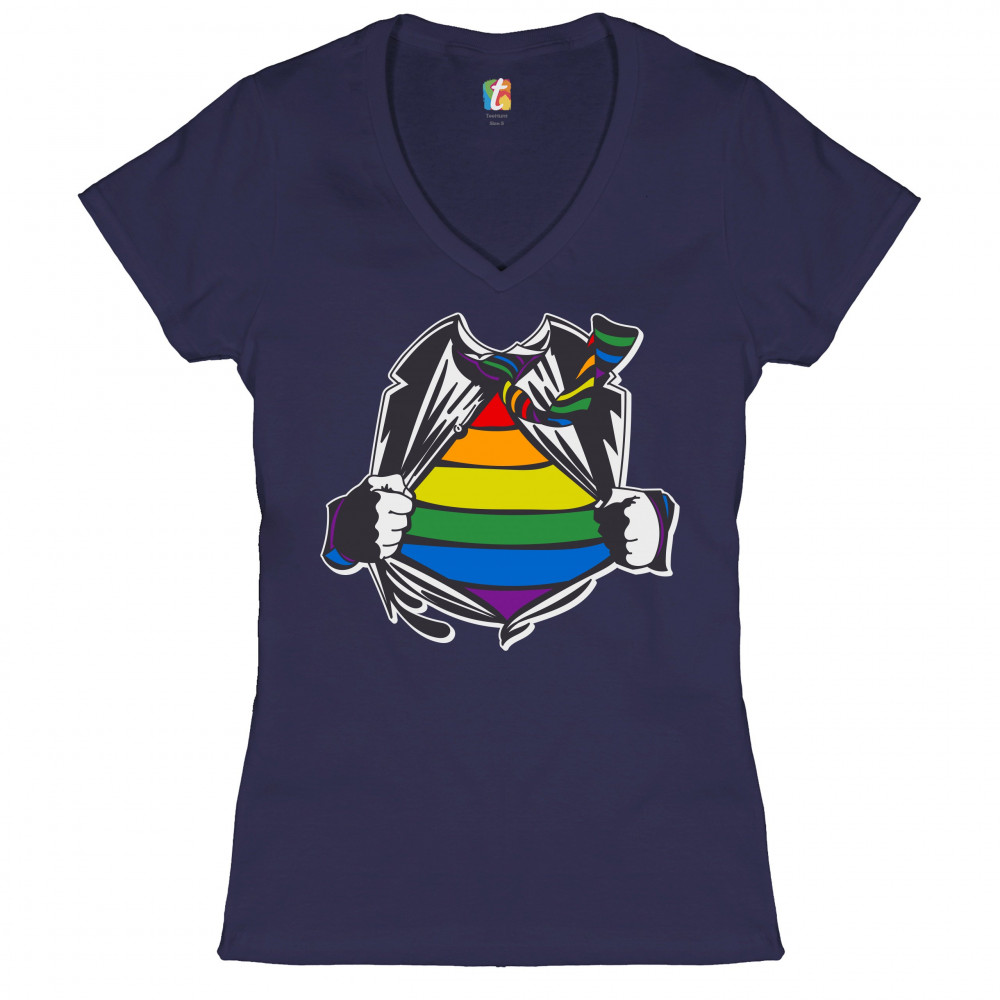 GAY SUPERHERO PARODY women's v-neck t-shirt lesbian bi transgender rainbow tee navy blue