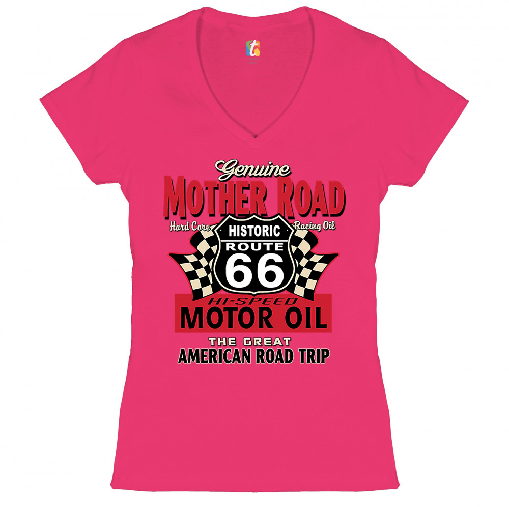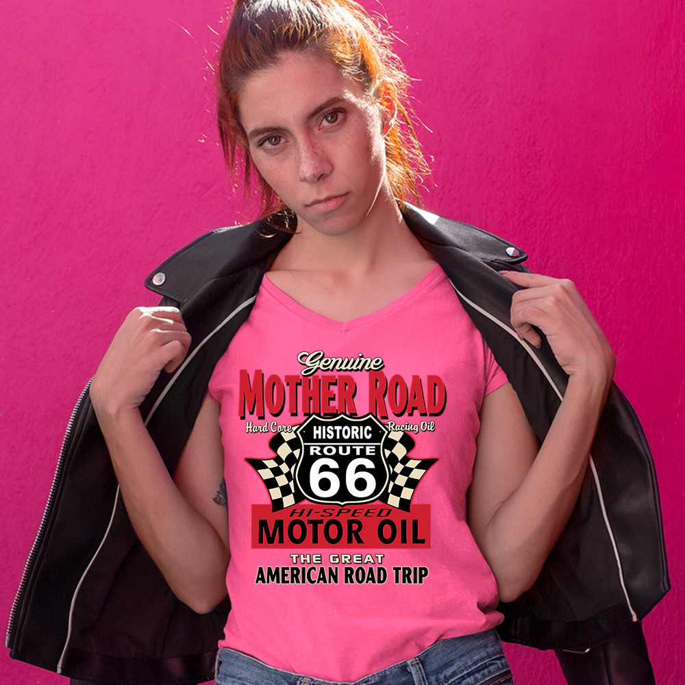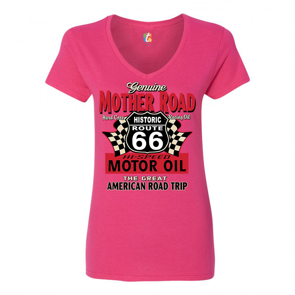 GENUINE MOTHER ROAD HISTORIC ROUTE 66 women's v-neck t-shirt road trip tee pink