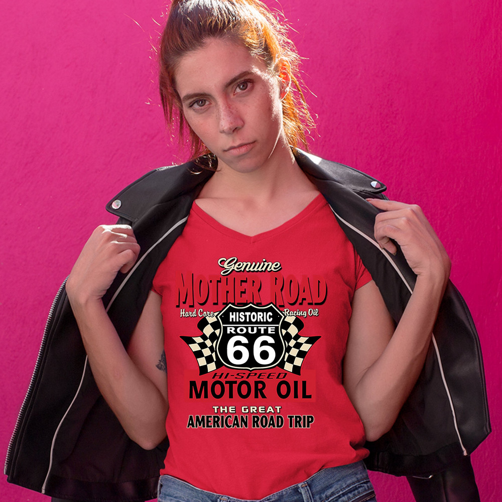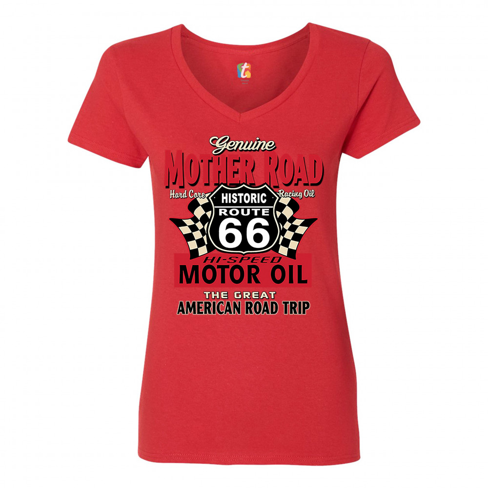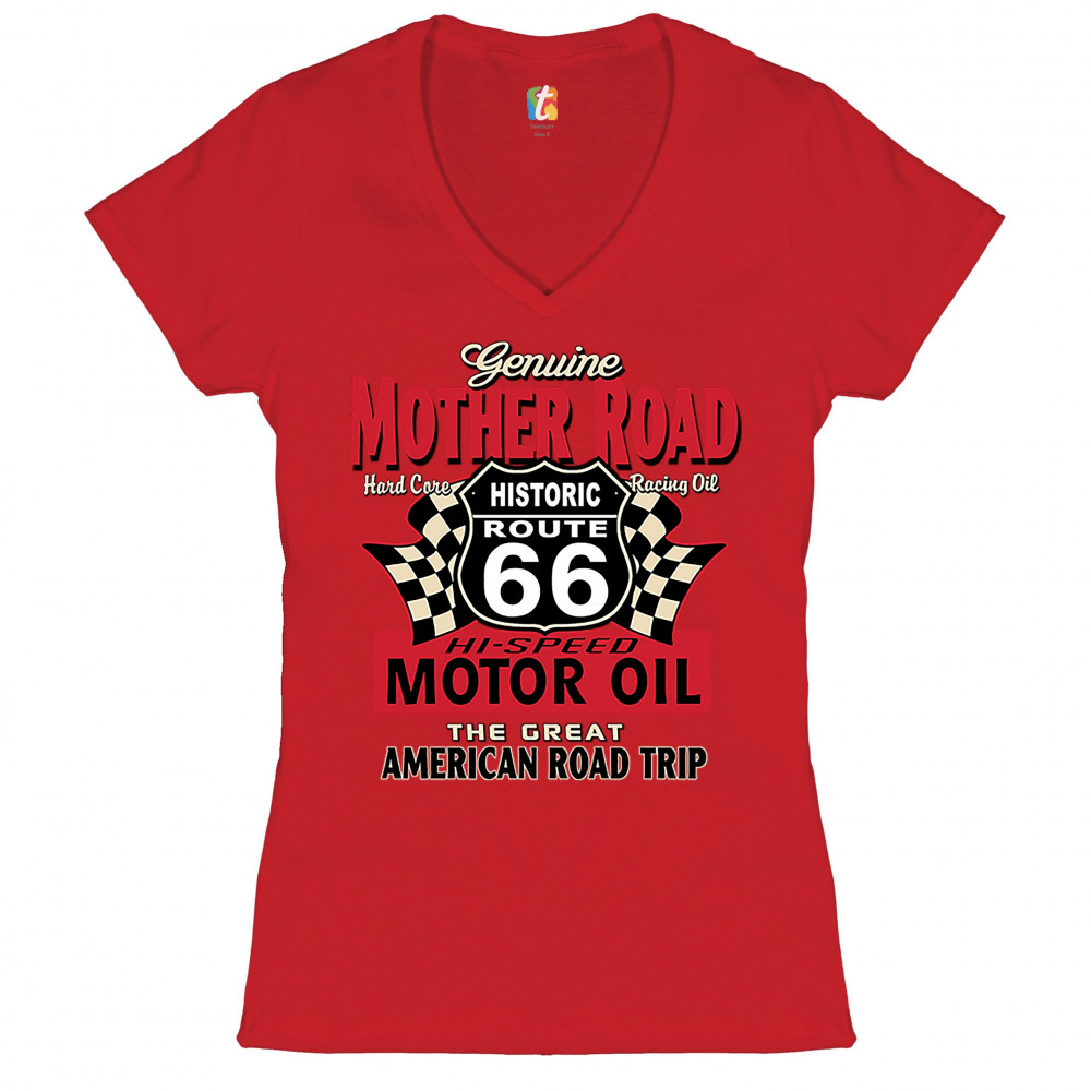 GENUINE MOTHER ROAD HISTORIC ROUTE 66 women's v-neck t-shirt road trip tee red