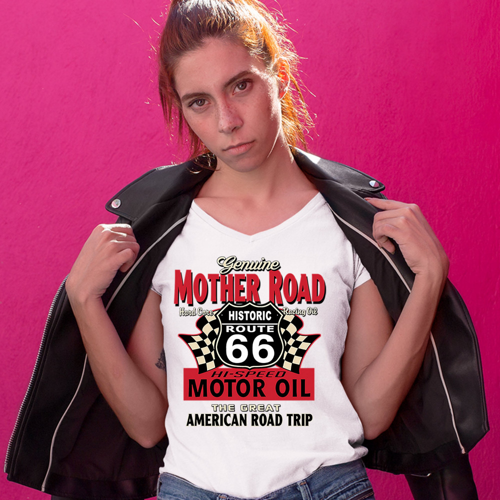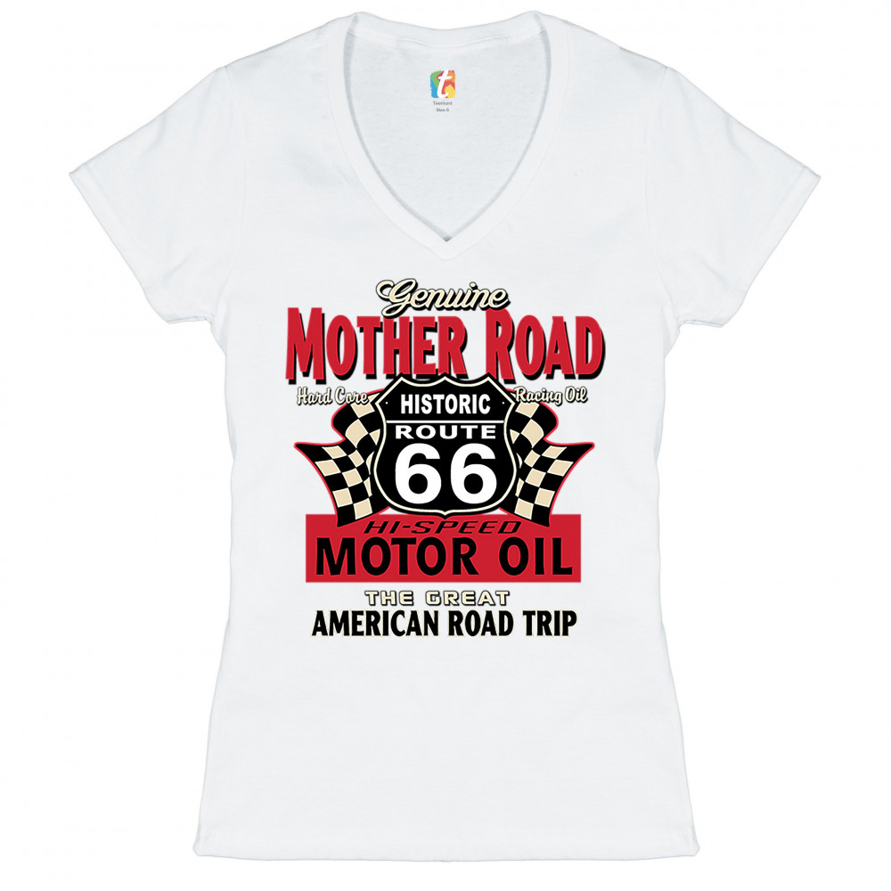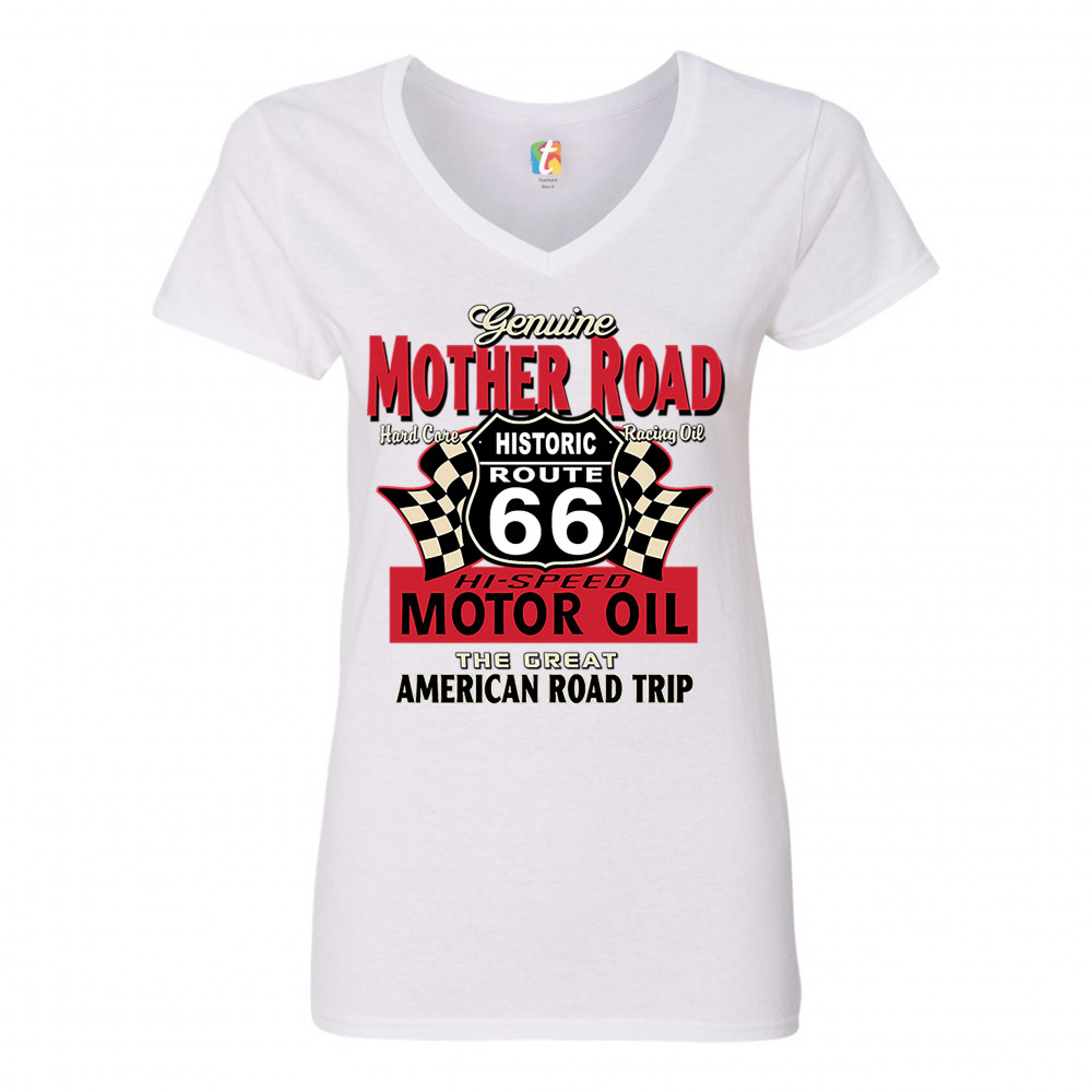 GENUINE MOTHER ROAD HISTORIC ROUTE 66 women's v-neck t-shirt road trip tee white