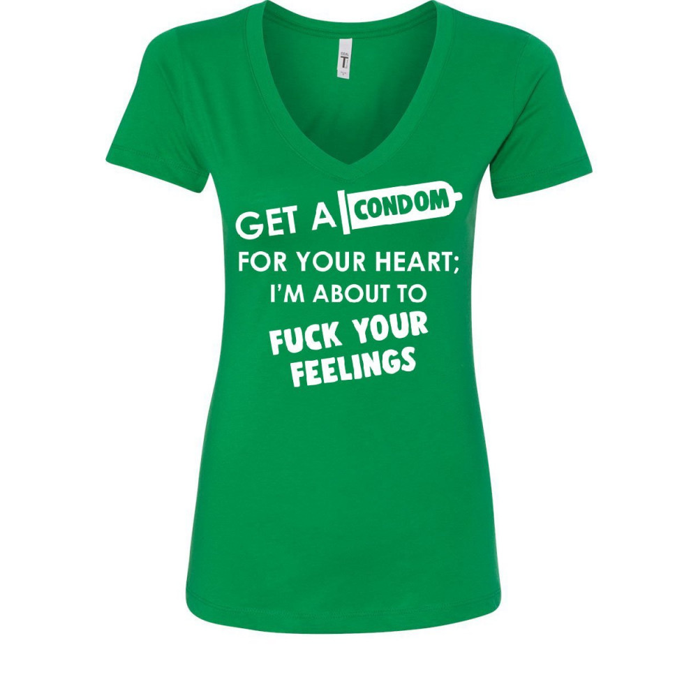 GET A CONDOM FOR YOUR HEART women's v-neck t-shirt funny rude offensive humor green