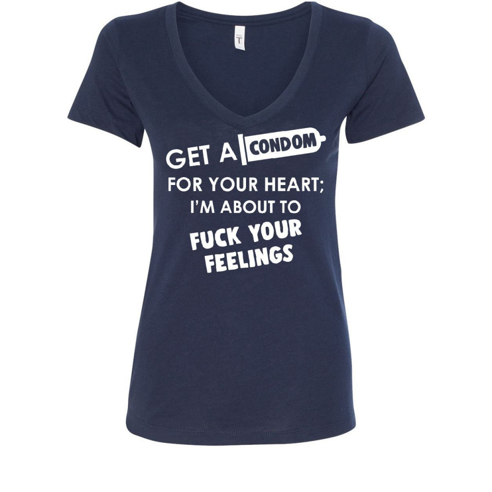 GET A CONDOM FOR YOUR HEART women's v-neck t-shirt funny rude offensive humor navy blue