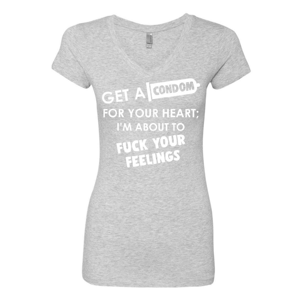 GET A CONDOM FOR YOUR HEART women's v-neck t-shirt funny rude offensive humor gray