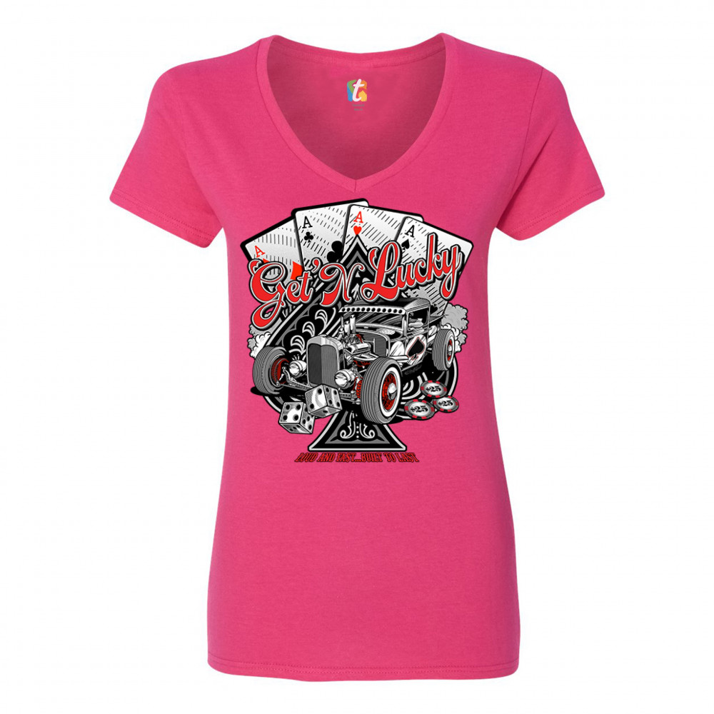 A print featuring a hot rod and a giant ace of spades behind it. In the background there are four aces of every suit. In front of the car there are 2 dices and several casino chips. The print says: "Get'n lucky, louad and fast… built to last". A great cho