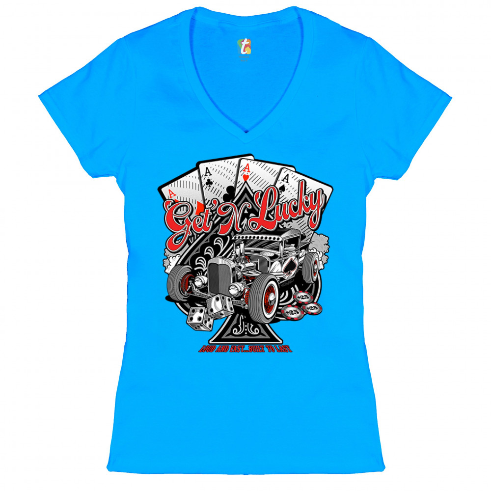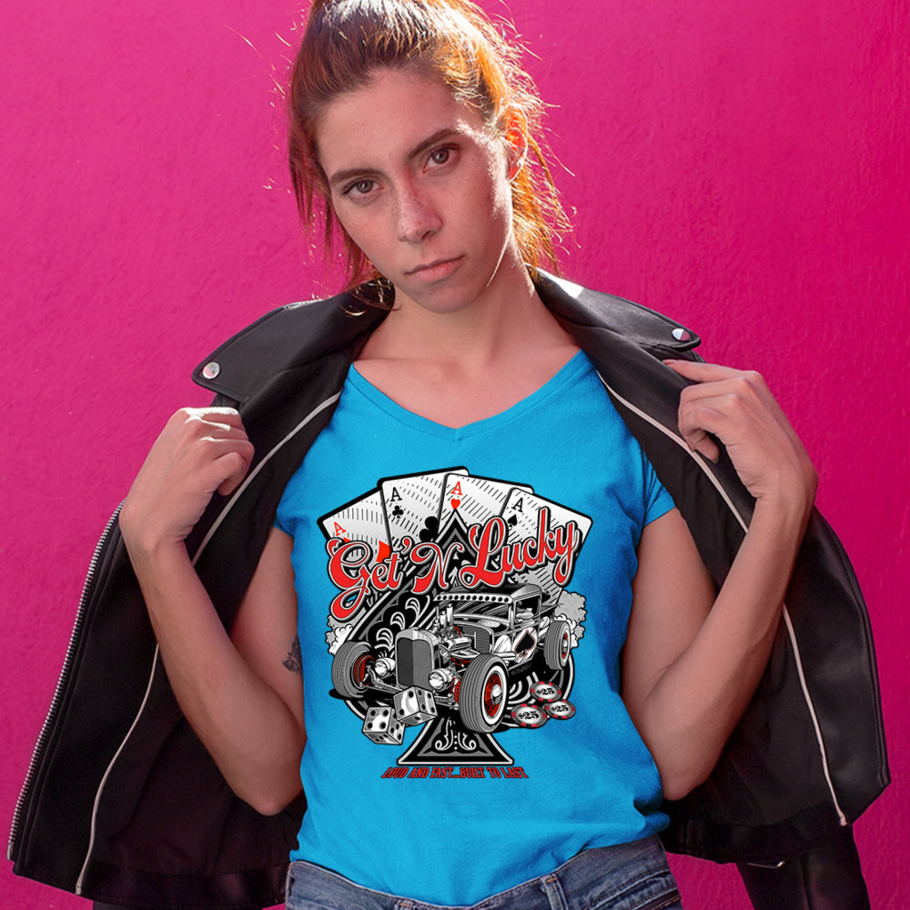 A print featuring a hot rod and a giant ace of spades behind it. In the background there are four aces of every suit. In front of the car there are 2 dices and several casino chips. The print says: "Get'n lucky, louad and fast… built to last". A great cho