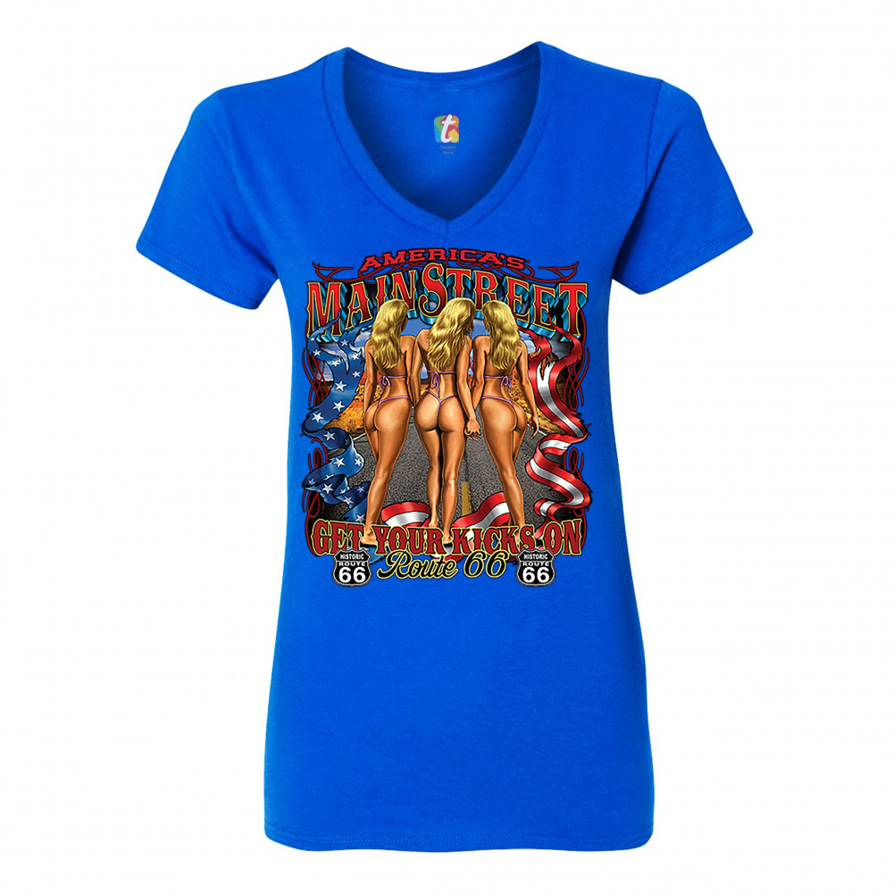 GET YOUR KICKS ON ROUTE 66 women's v-neck t-shirt girls in bikinis biker tee royal blue