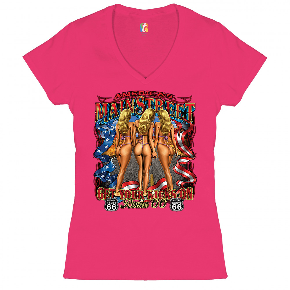A print featuring three scantily-clad blondes holding each other's hands walking on a highway. The print says: "America's Main Street, Get Your Kicks on Route 66" and also features a ribbon with stars and stripes on it and two "Historic Route 66" signs. A