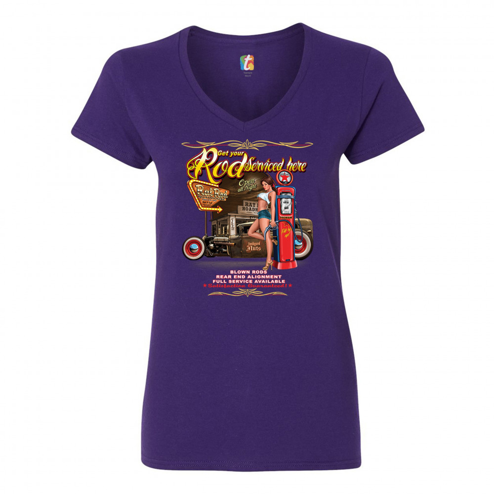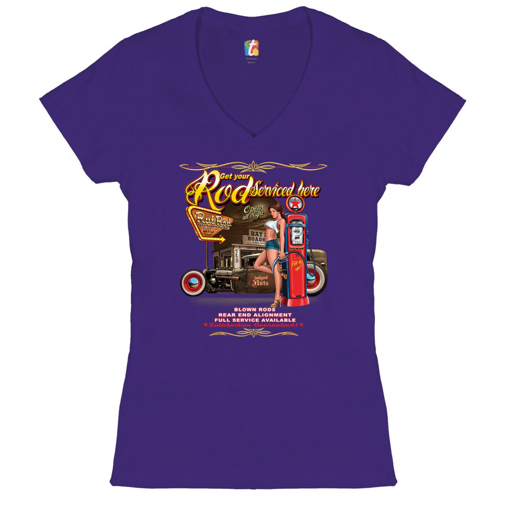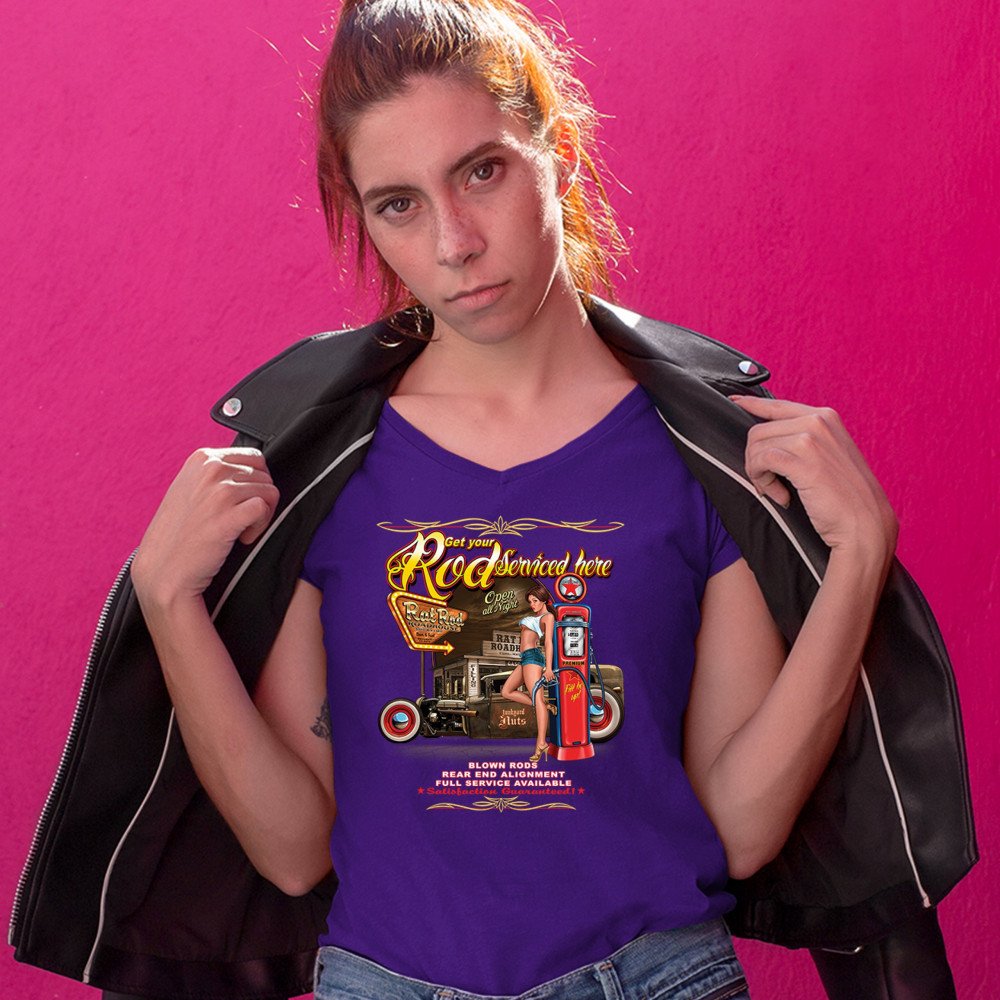 A print featuring a sexy pin-up girl leaning on a gas pump. There is a hot rod behind her and a "Rat Rod Roudhouse" in the background. The print also includes a bunch of innuendos: "get your rod serviced here, blown rods, rear end alignment, full service