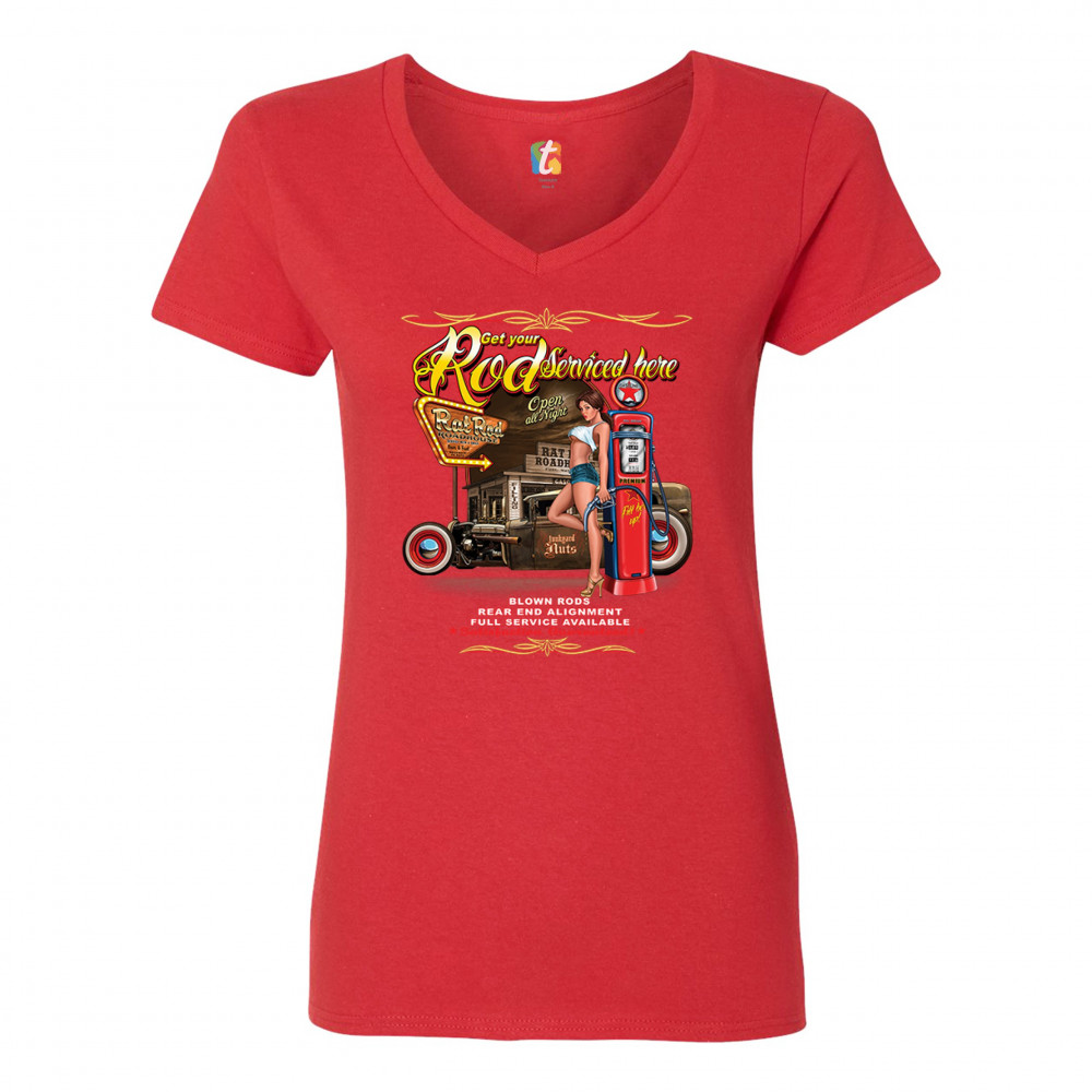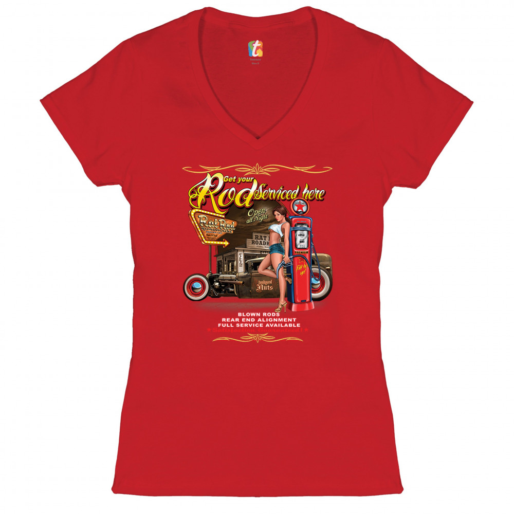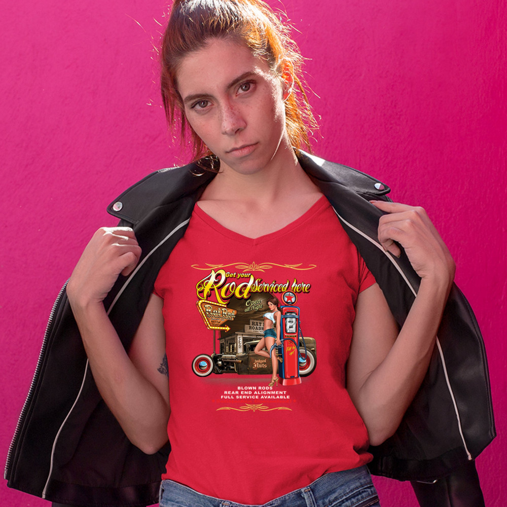 A print featuring a sexy pin-up girl leaning on a gas pump. There is a hot rod behind her and a "Rat Rod Roudhouse" in the background. The print also includes a bunch of innuendos: "get your rod serviced here, blown rods, rear end alignment, full service