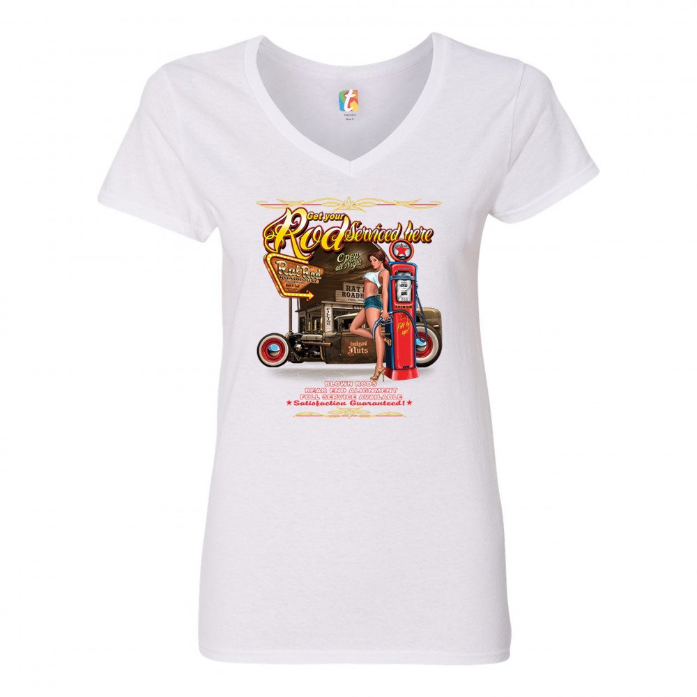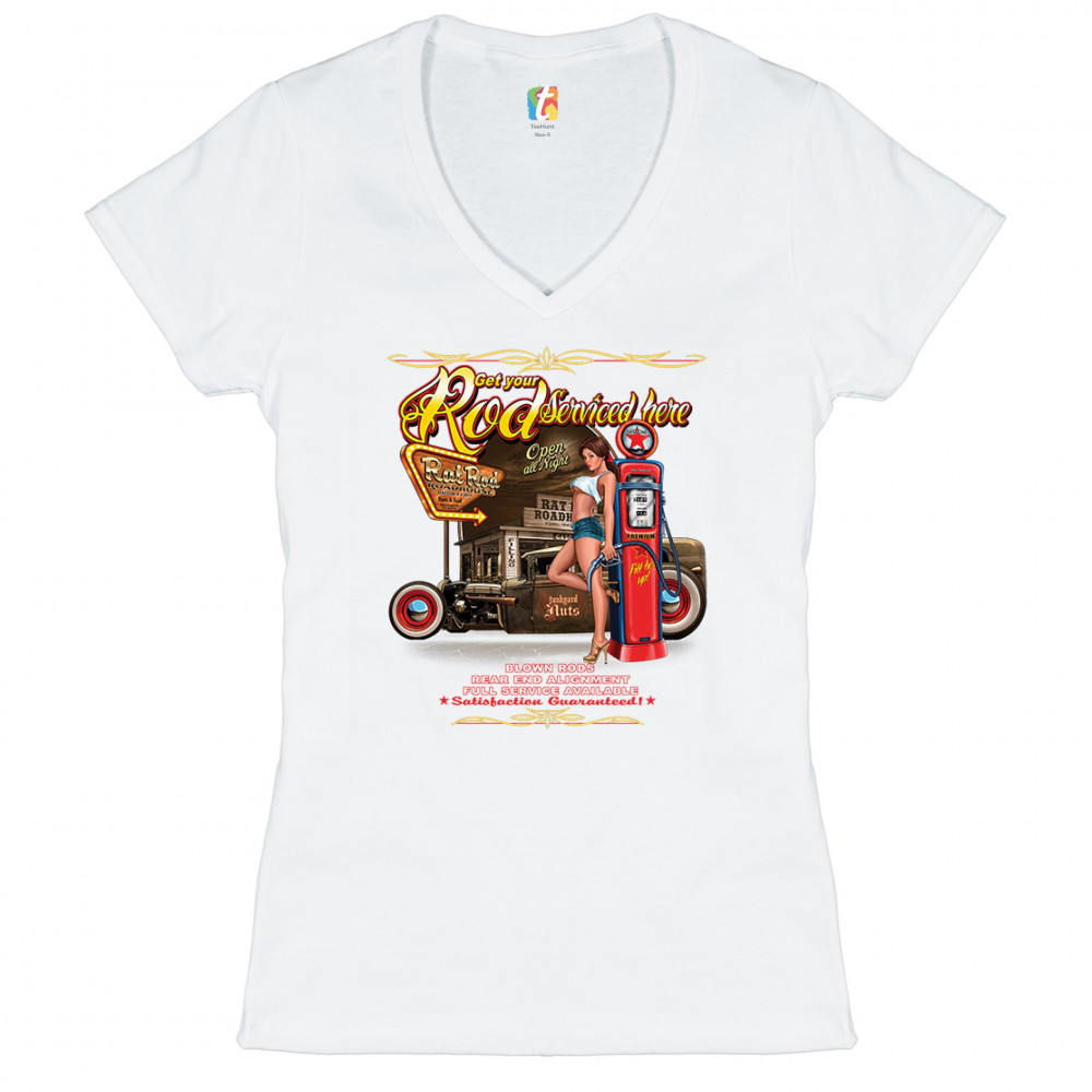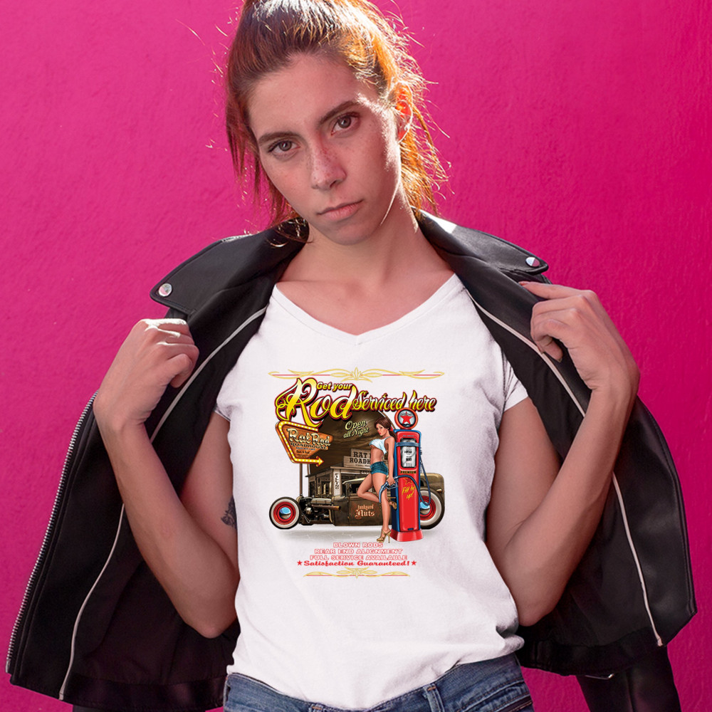 A print featuring a sexy pin-up girl leaning on a gas pump. There is a hot rod behind her and a "Rat Rod Roudhouse" in the background. The print also includes a bunch of innuendos: "get your rod serviced here, blown rods, rear end alignment, full service