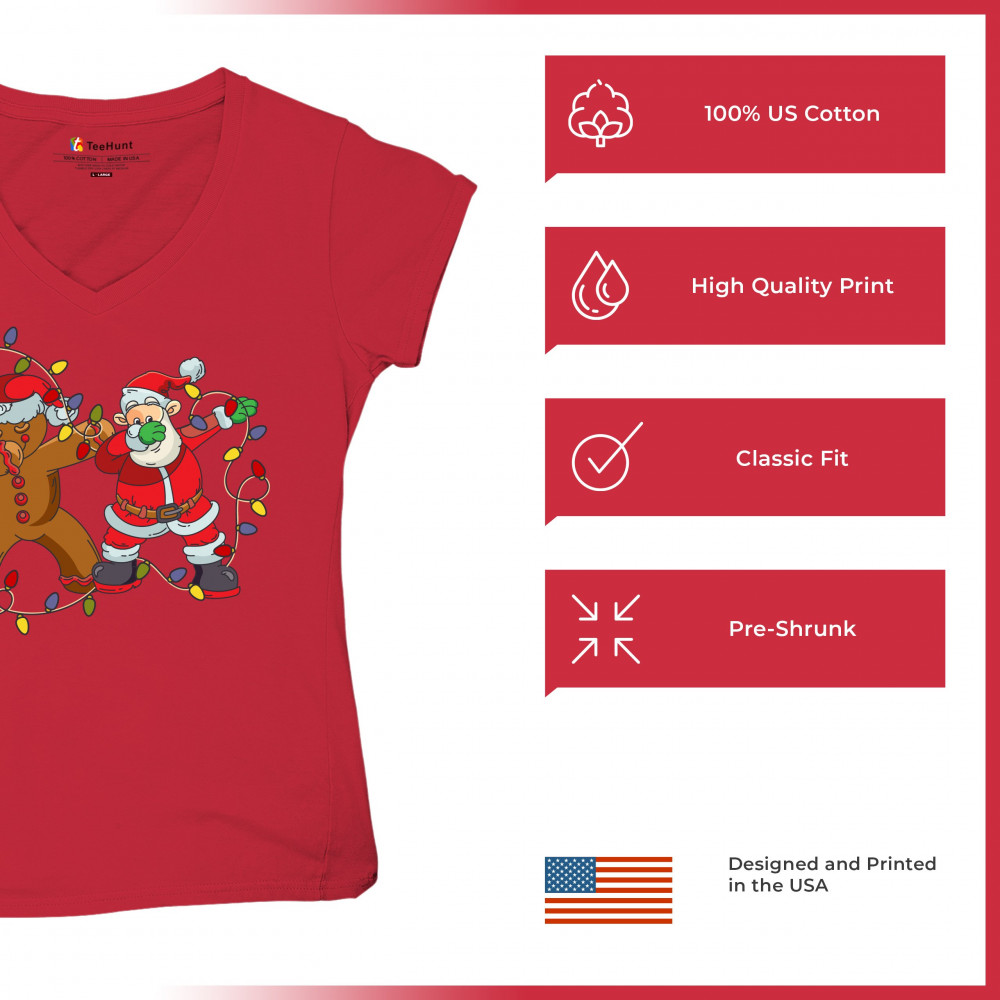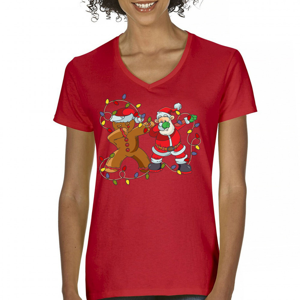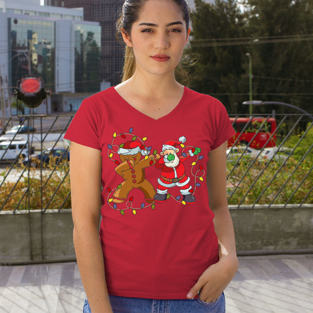 GINGERBREAD MAN AND SANTA CLAUS DAB DANCE women's v-neck t-shirt christmas tee red