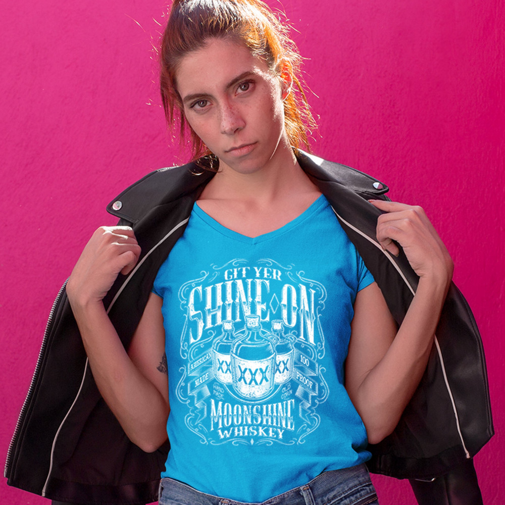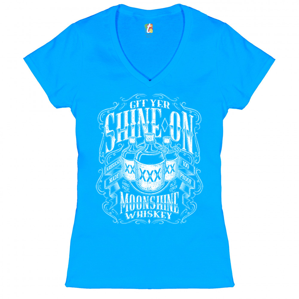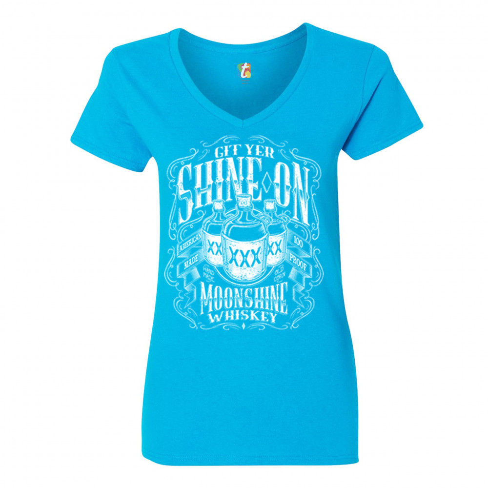 GIT YER SHINE ON MOONSHINE WHISKEY women's v-neck t-shirt xxx drinking tee turquoise