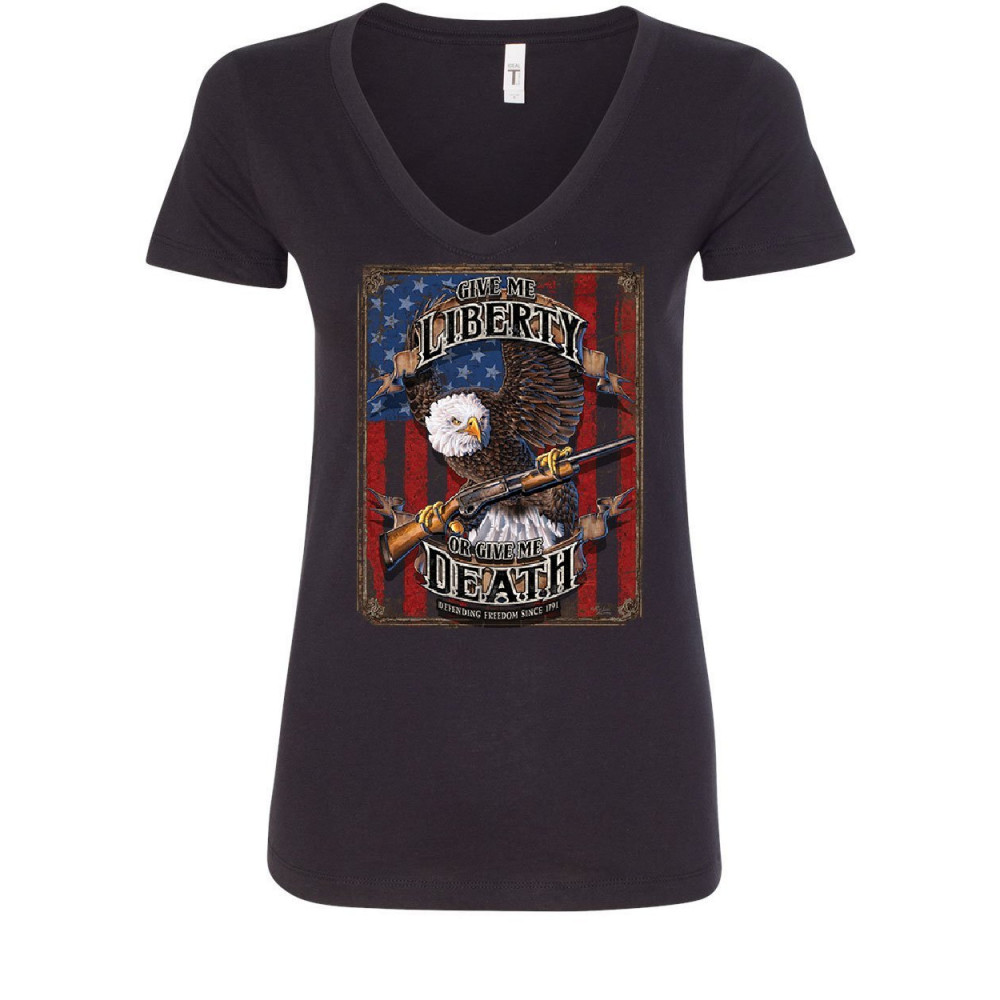 GIVE ME LIBERTY OR GIVE ME DEATH women's v-neck t-shirt eagle defend freedom 2a black