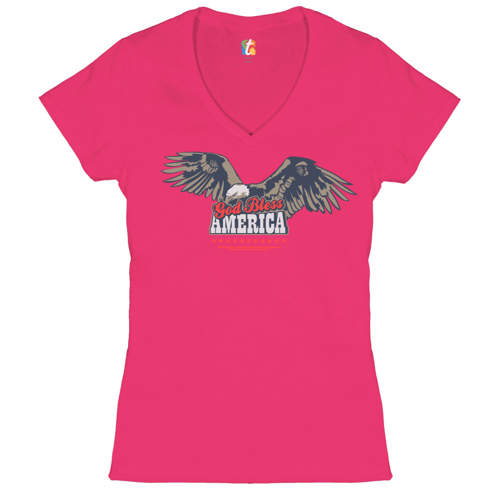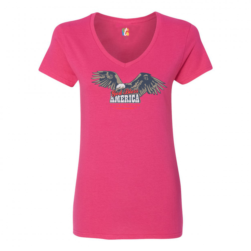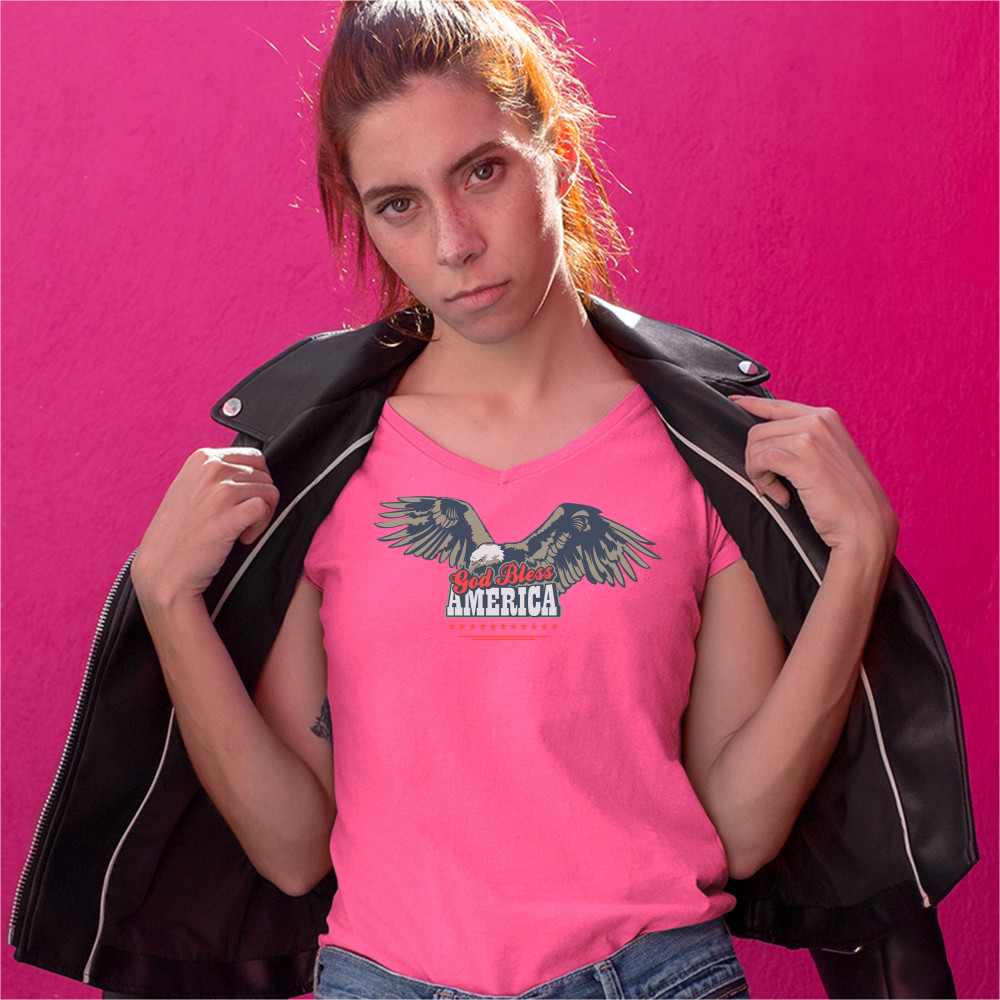 GOD BLESS AMERICA women's v-neck t-shirt 4th of july bald eagle patriotic tee pink
