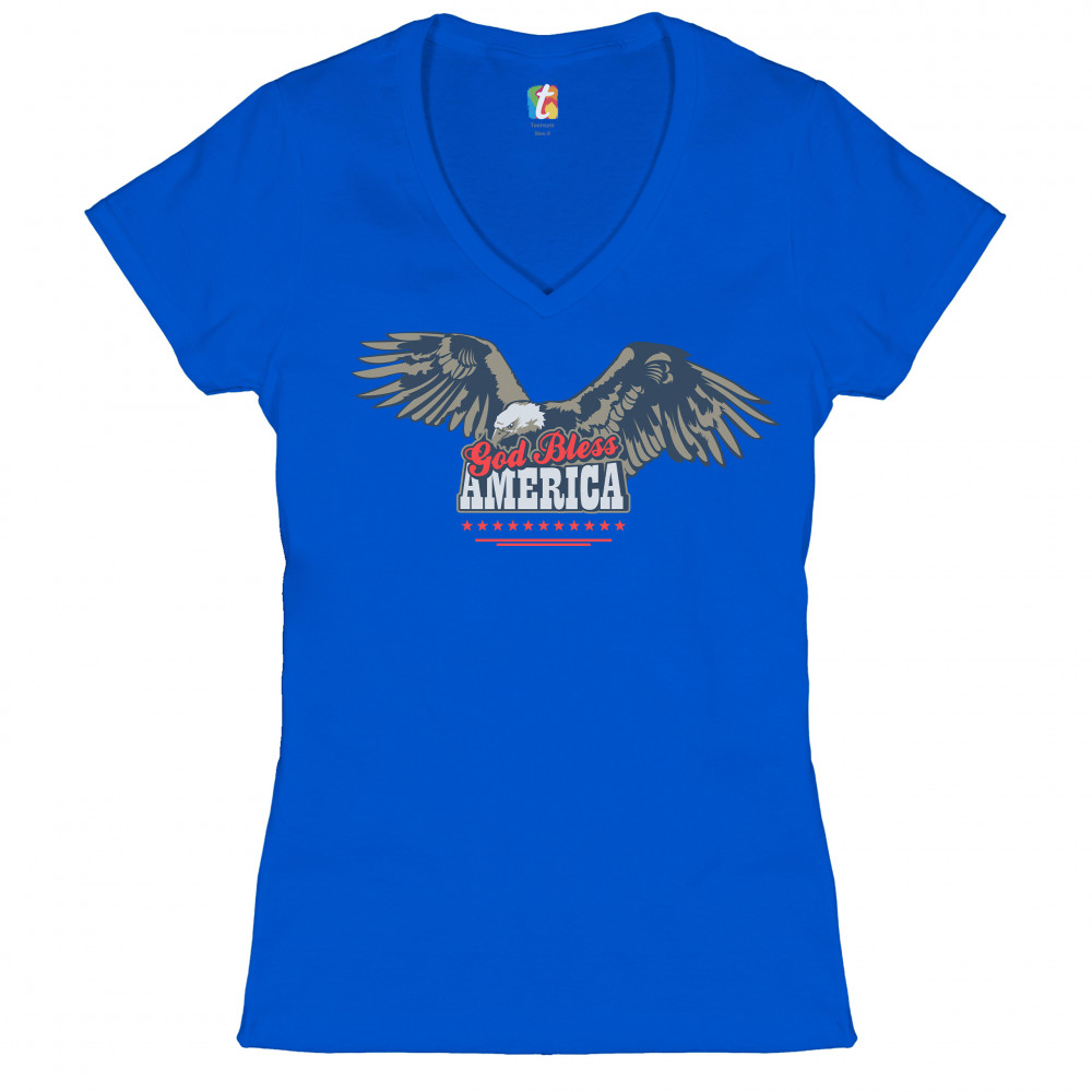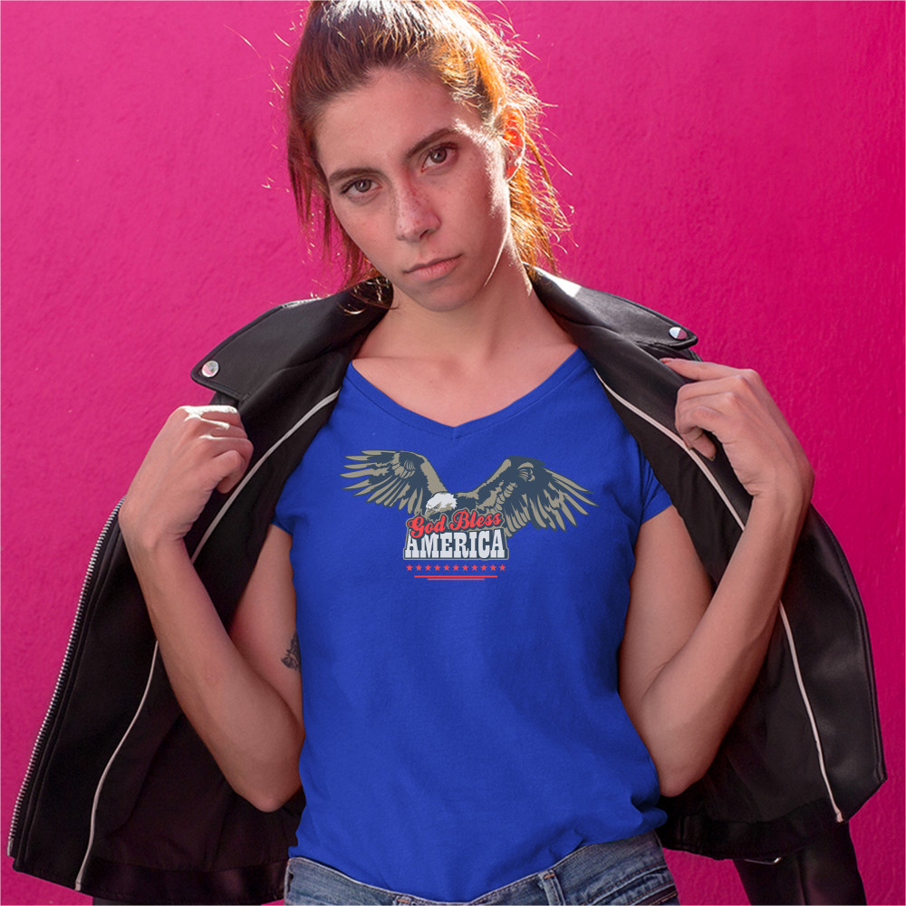GOD BLESS AMERICA women's v-neck t-shirt 4th of july bald eagle patriotic tee royal blue