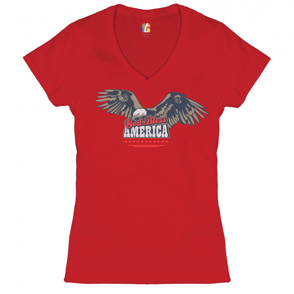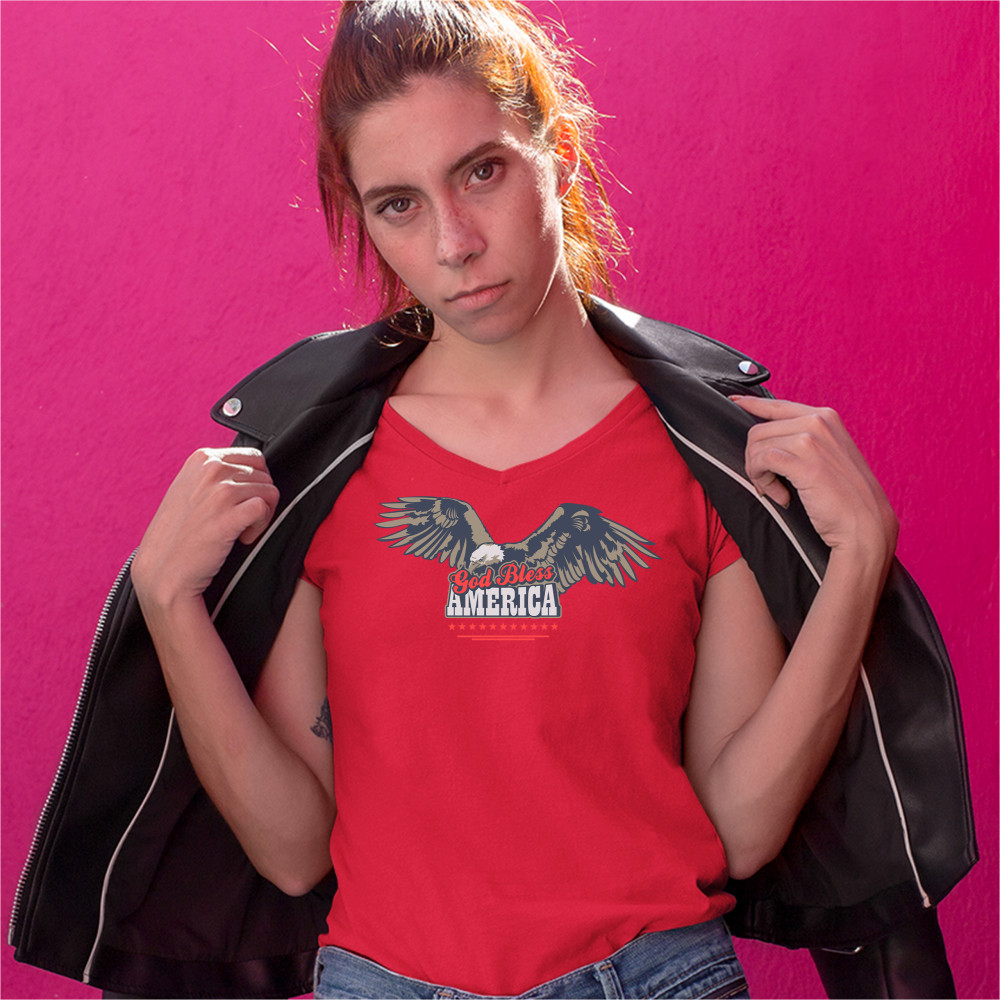 GOD BLESS AMERICA women's v-neck t-shirt 4th of july bald eagle patriotic tee red
