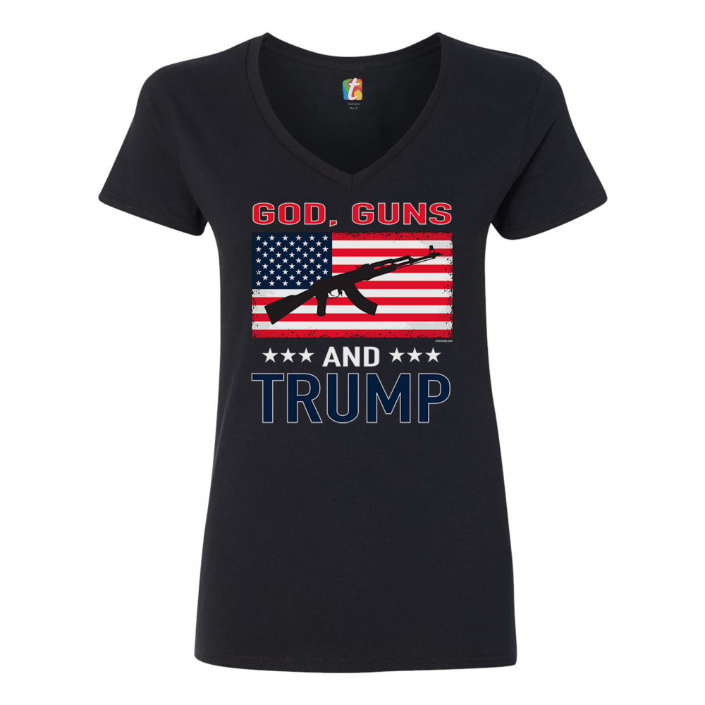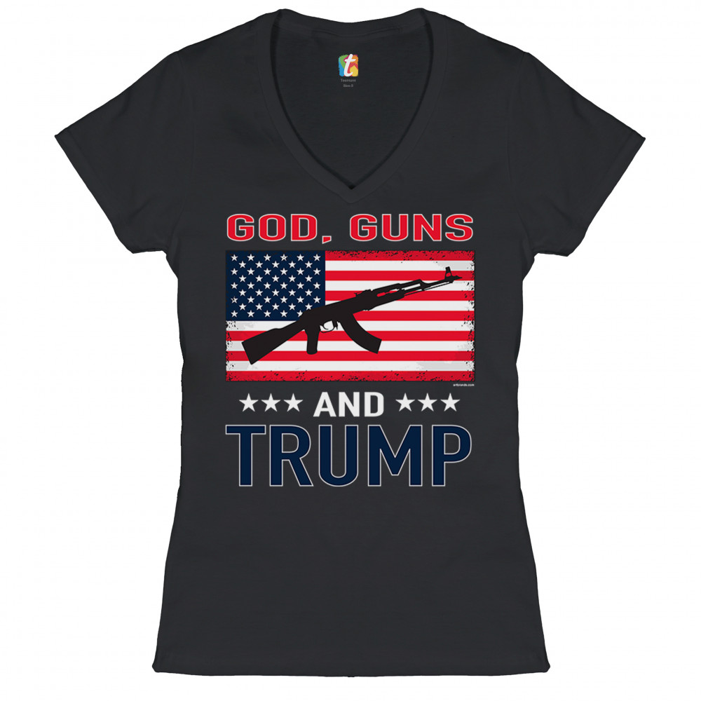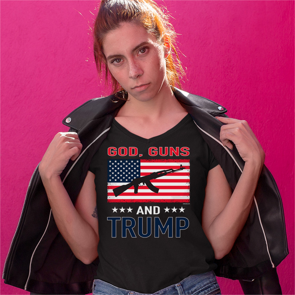 A political print saying "God, Guns and Trump". In the center there is the American flag with a silhouette of AK-47 rifle on it. A great choice to wear for a Trump rally or give as a gift to a Donald Trump and Mike Pence supporter before 2020 presidential elections.