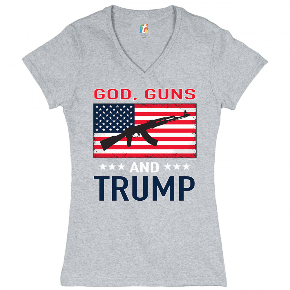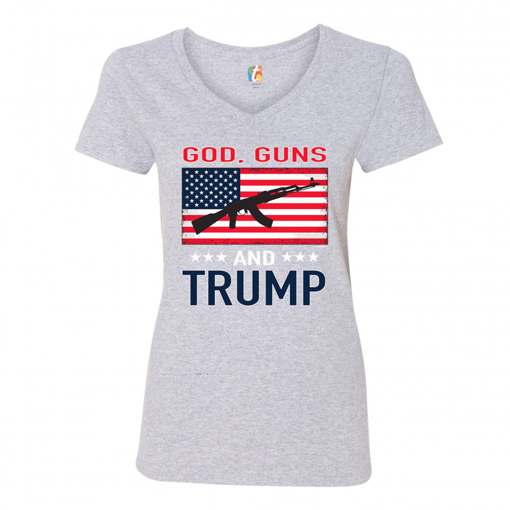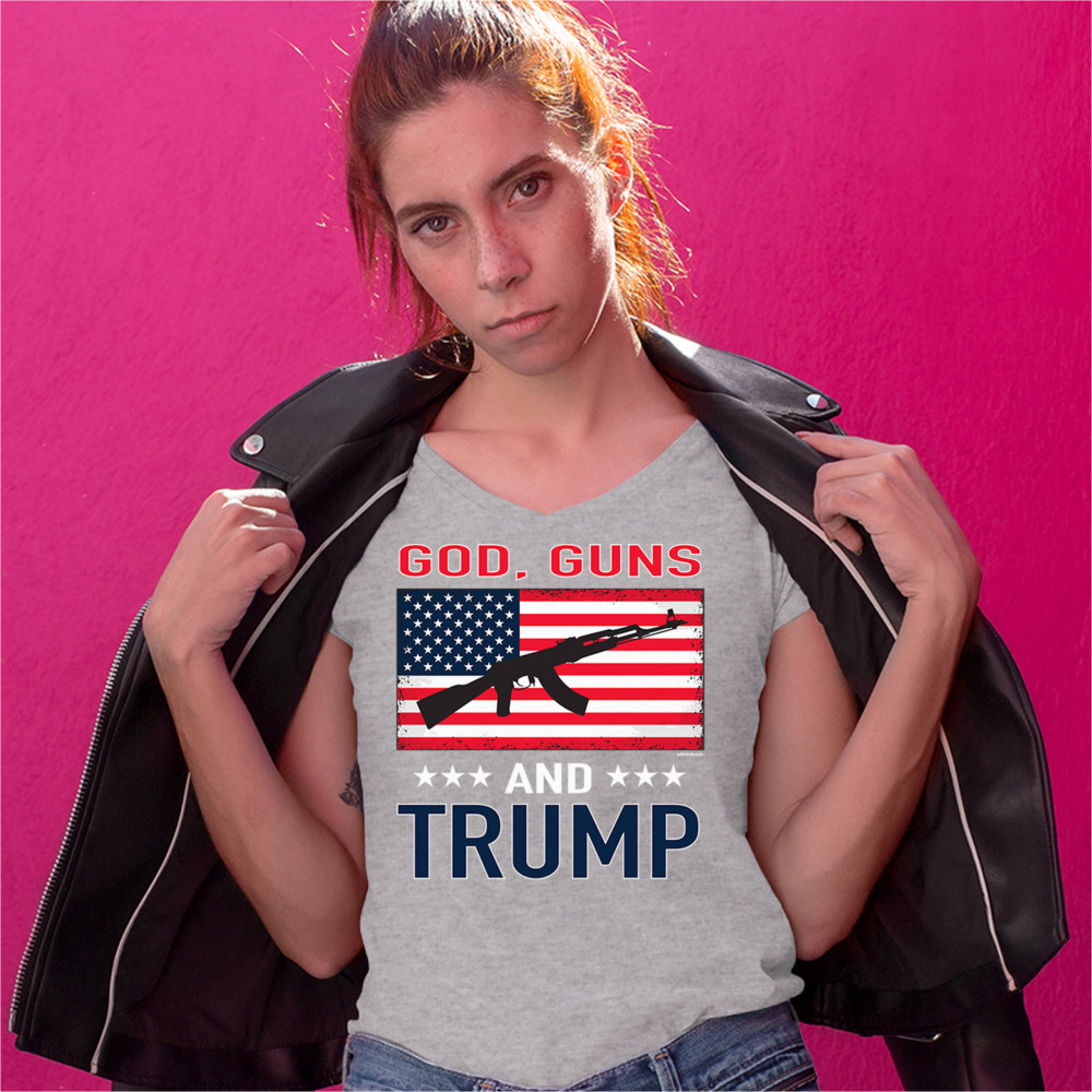 A political print saying "God, Guns and Trump". In the center there is the American flag with a silhouette of AK-47 rifle on it. A great choice to wear for a Trump rally or give as a gift to a Donald Trump and Mike Pence supporter before 2020 presidential elections.