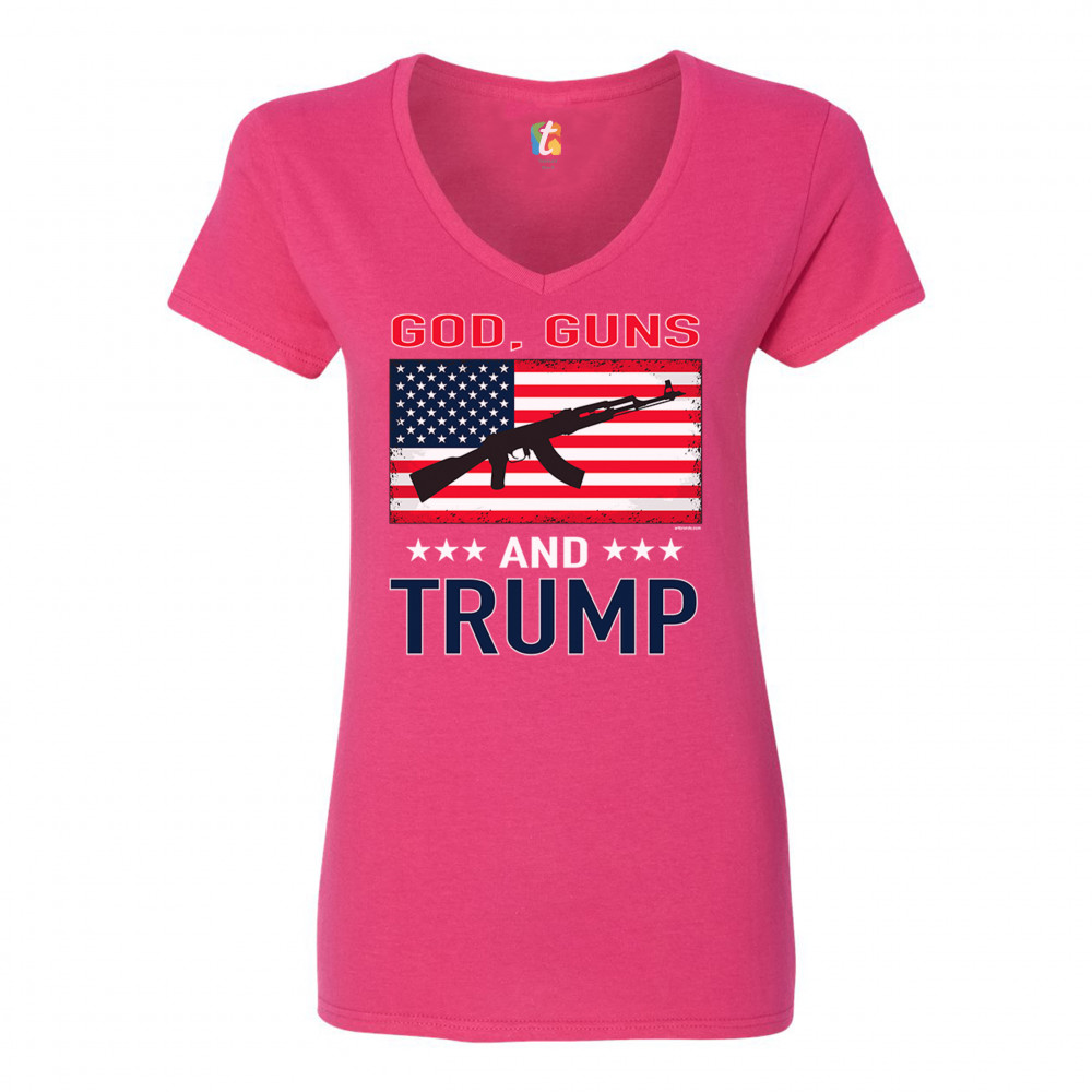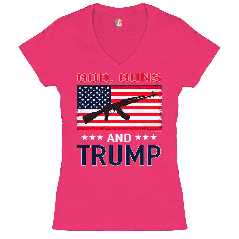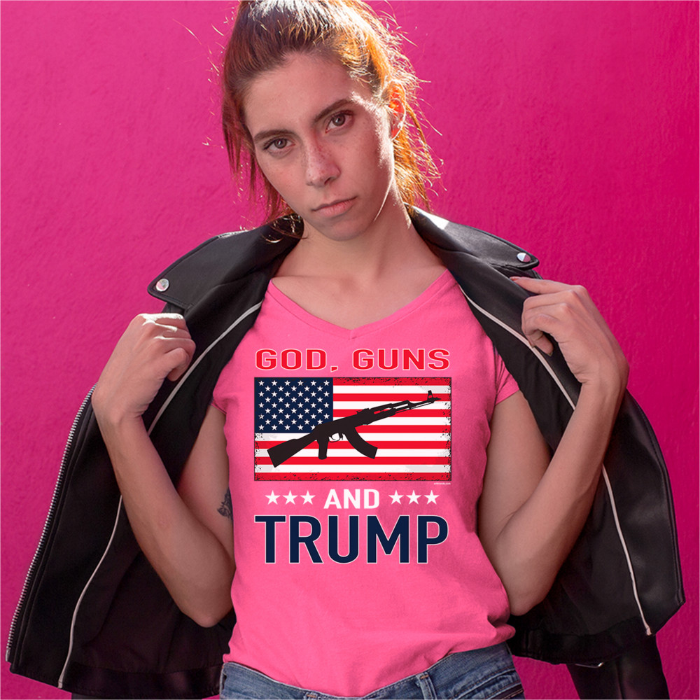 A political print saying "God, Guns and Trump". In the center there is the American flag with a silhouette of AK-47 rifle on it. A great choice to wear for a Trump rally or give as a gift to a Donald Trump and Mike Pence supporter before 2020 presidential elections.