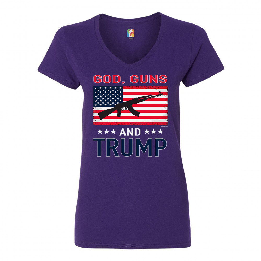 A political print saying "God, Guns and Trump". In the center there is the American flag with a silhouette of AK-47 rifle on it. A great choice to wear for a Trump rally or give as a gift to a Donald Trump and Mike Pence supporter before 2020 presidential elections.