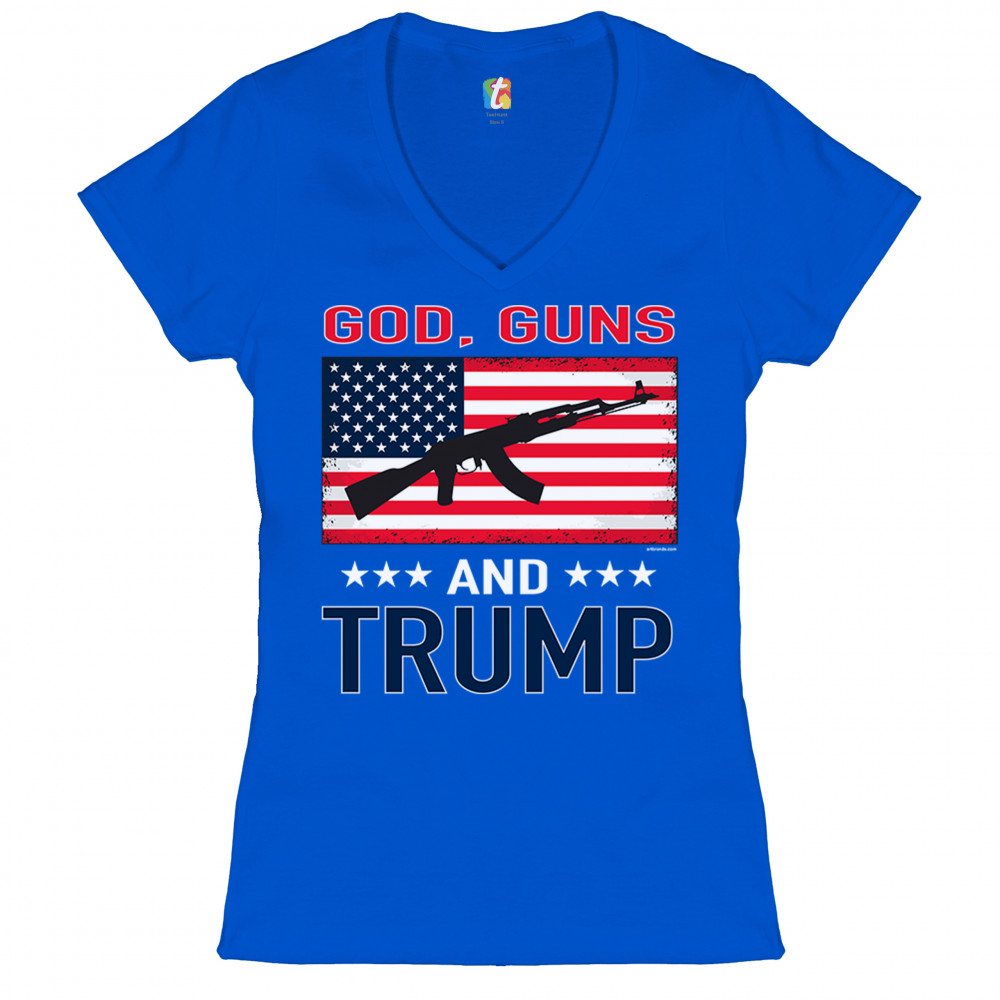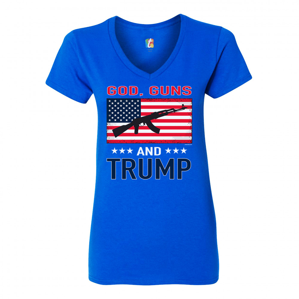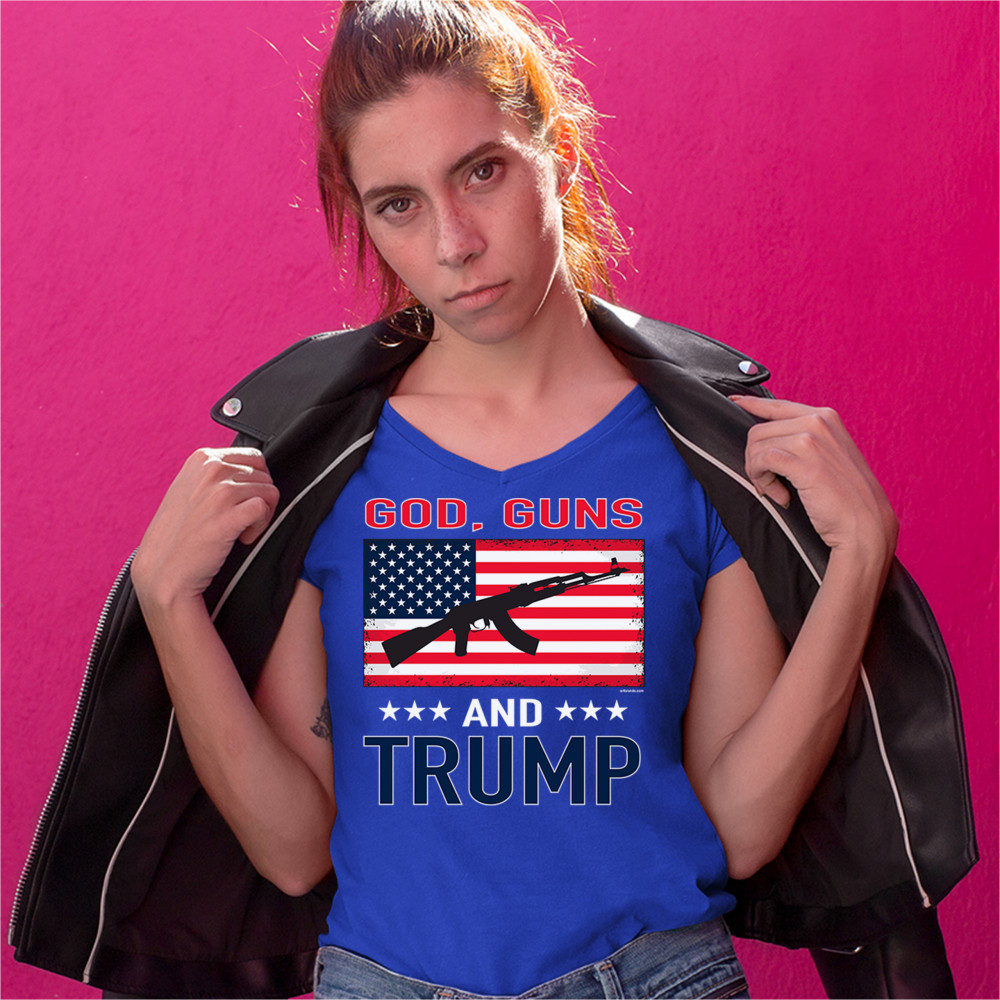 A political print saying "God, Guns and Trump". In the center there is the American flag with a silhouette of AK-47 rifle on it. A great choice to wear for a Trump rally or give as a gift to a Donald Trump and Mike Pence supporter before 2020 presidential elections.