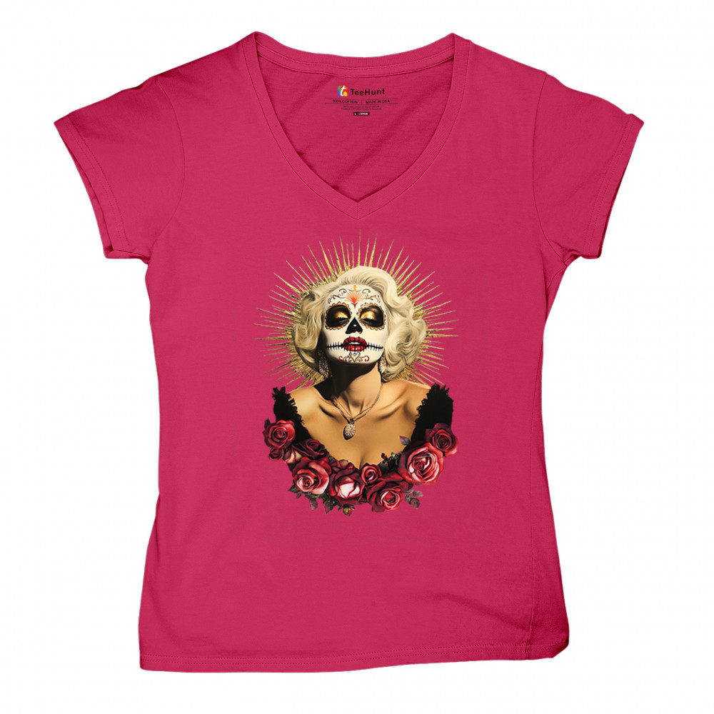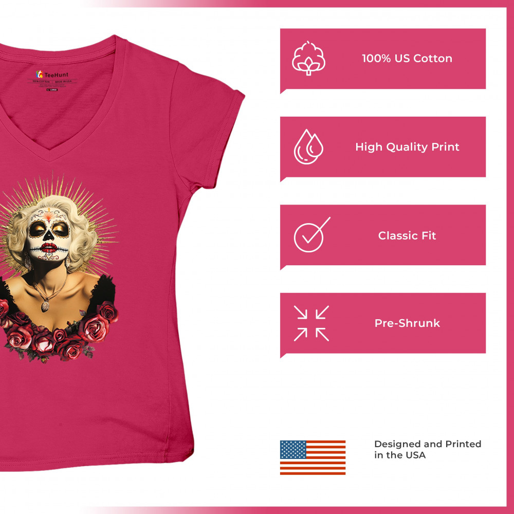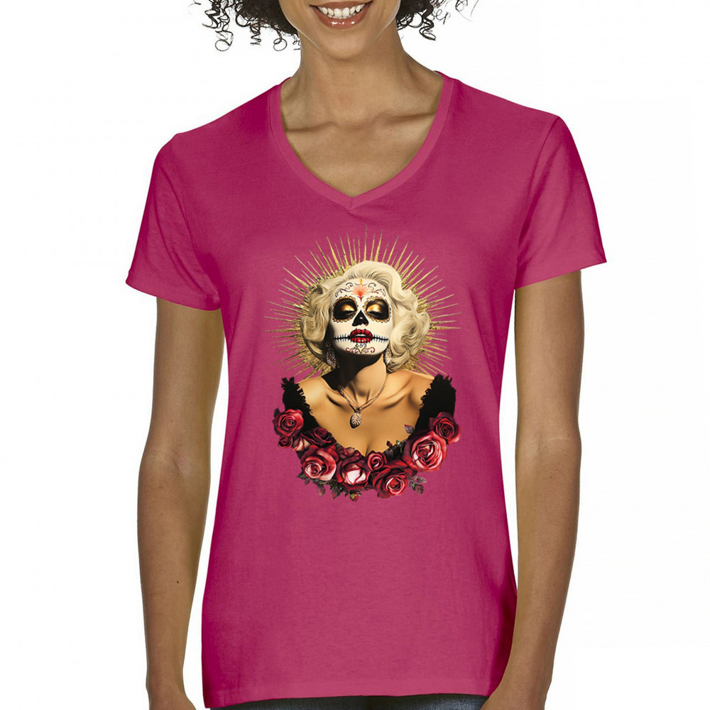 This bold and beautiful sugar skull design features a glamorous calavera woman crowned in a golden halo and framed by roses. A divine tribute to Dia de los Muertos, this look blends vintage glam, Latin culture, makeup artistry, and sacred symbolism. Perfect for fans of gothic beauty, Halloween, and heritage expression.
