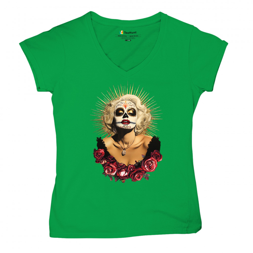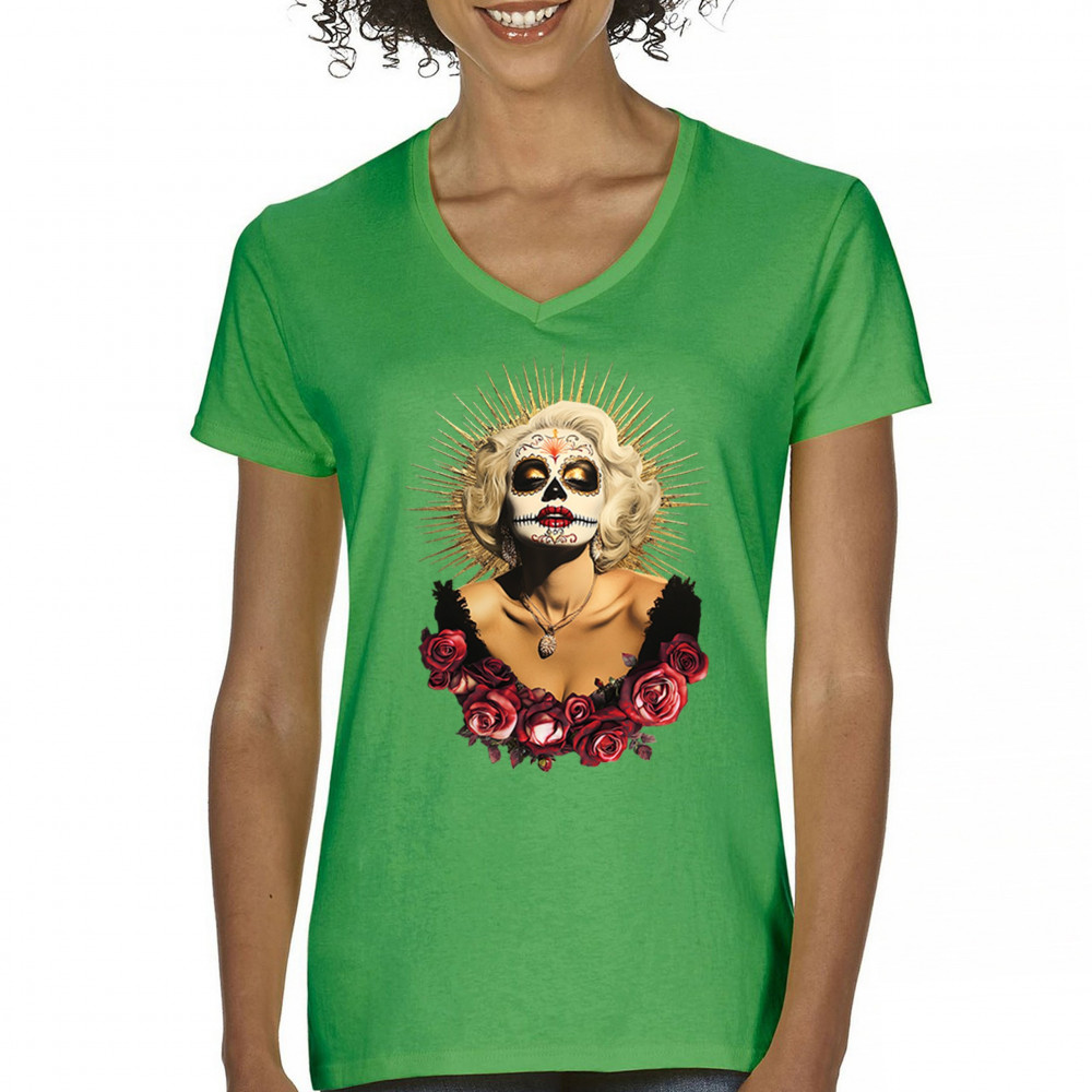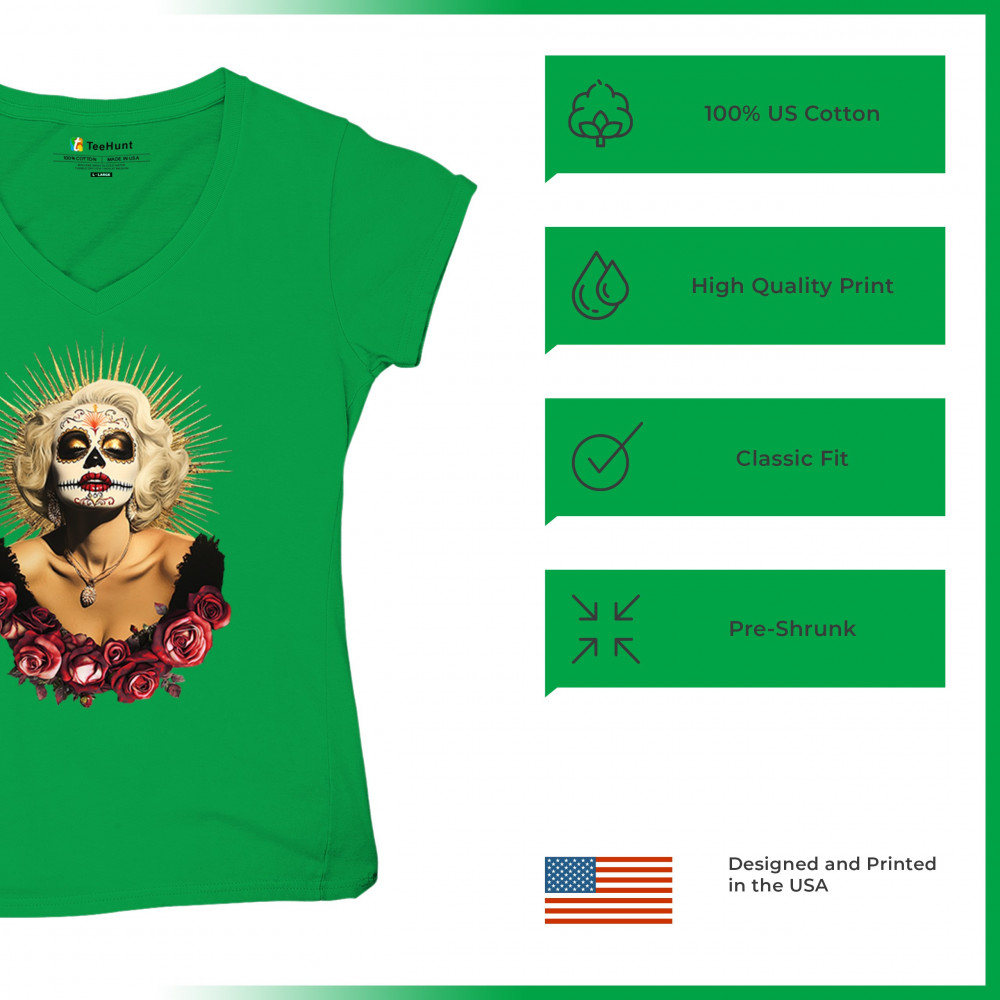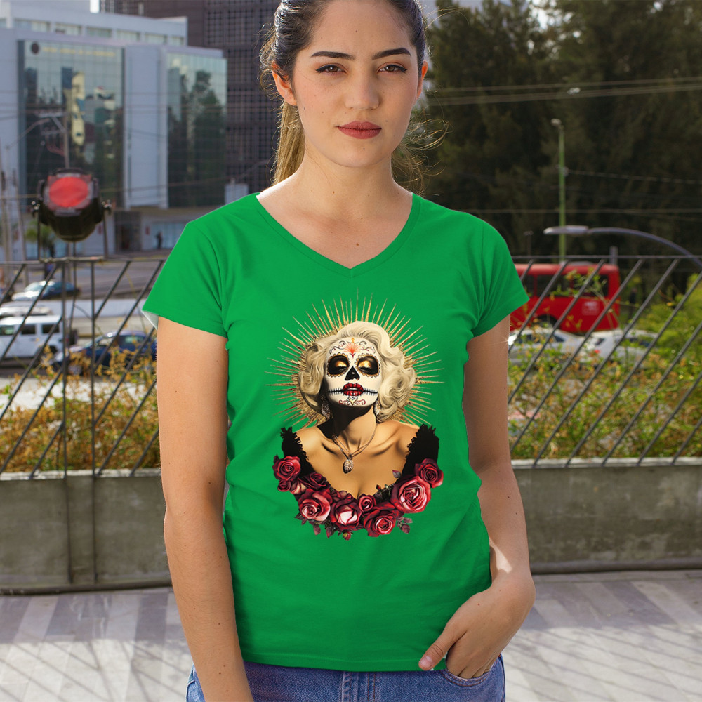 This bold and beautiful sugar skull design features a glamorous calavera woman crowned in a golden halo and framed by roses. A divine tribute to Dia de los Muertos, this look blends vintage glam, Latin culture, makeup artistry, and sacred symbolism. Perfect for fans of gothic beauty, Halloween, and heritage expression.