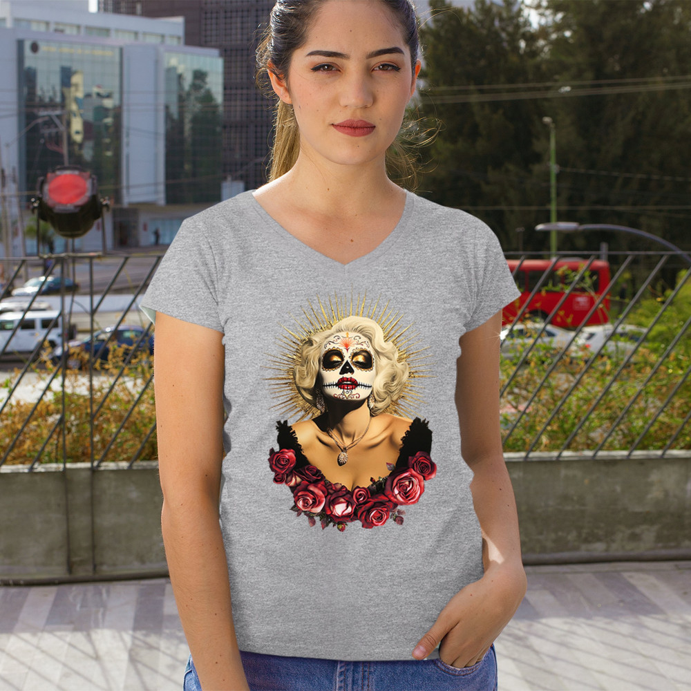 This bold and beautiful sugar skull design features a glamorous calavera woman crowned in a golden halo and framed by roses. A divine tribute to Dia de los Muertos, this look blends vintage glam, Latin culture, makeup artistry, and sacred symbolism. Perfect for fans of gothic beauty, Halloween, and heritage expression.