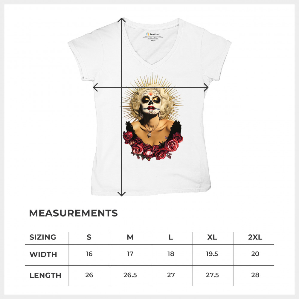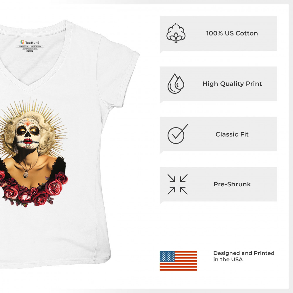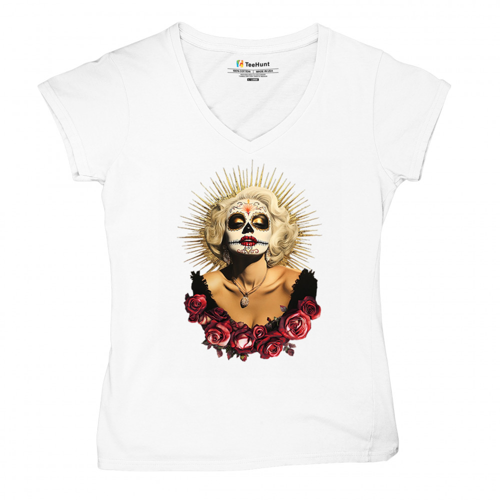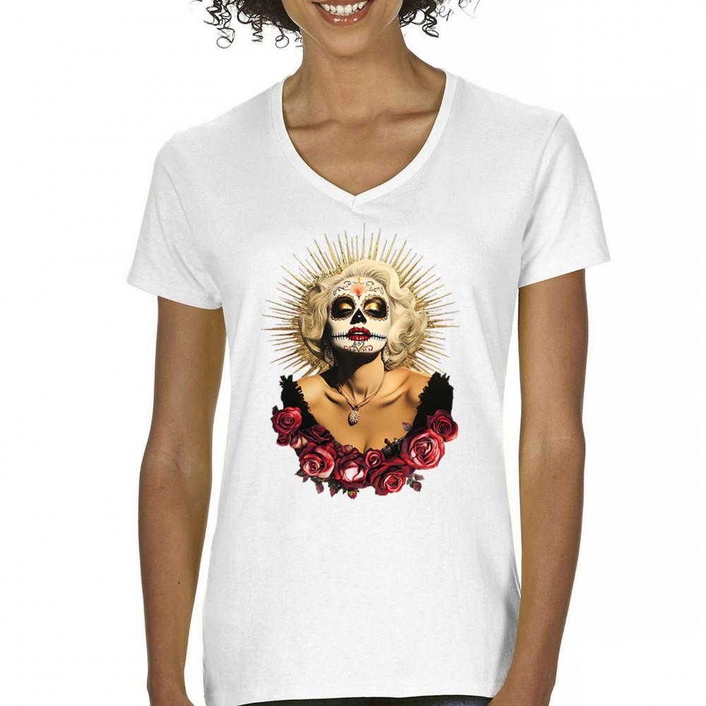 This bold and beautiful sugar skull design features a glamorous calavera woman crowned in a golden halo and framed by roses. A divine tribute to Dia de los Muertos, this look blends vintage glam, Latin culture, makeup artistry, and sacred symbolism. Perfect for fans of gothic beauty, Halloween, and heritage expression.