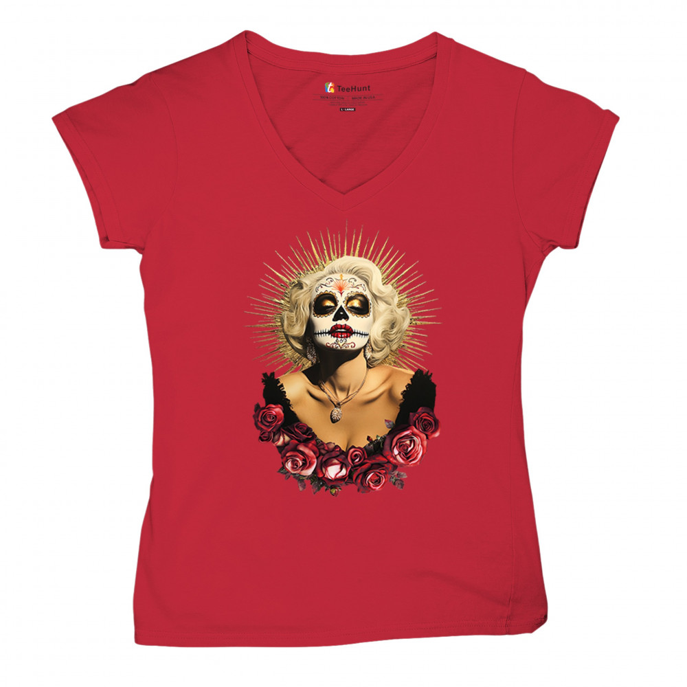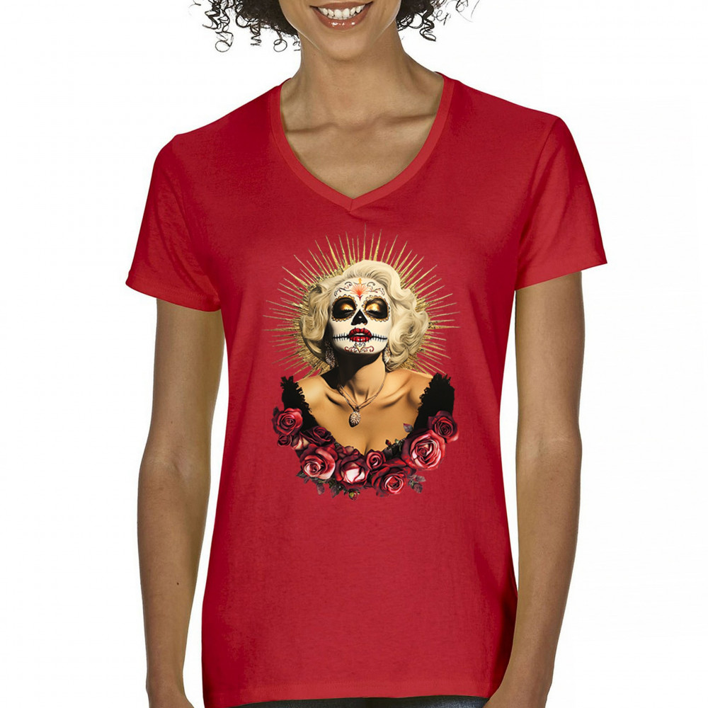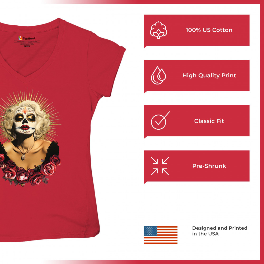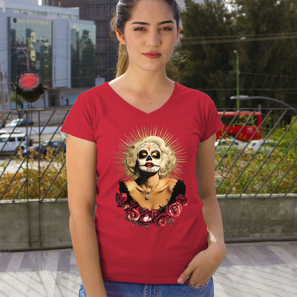 This bold and beautiful sugar skull design features a glamorous calavera woman crowned in a golden halo and framed by roses. A divine tribute to Dia de los Muertos, this look blends vintage glam, Latin culture, makeup artistry, and sacred symbolism. Perfect for fans of gothic beauty, Halloween, and heritage expression.