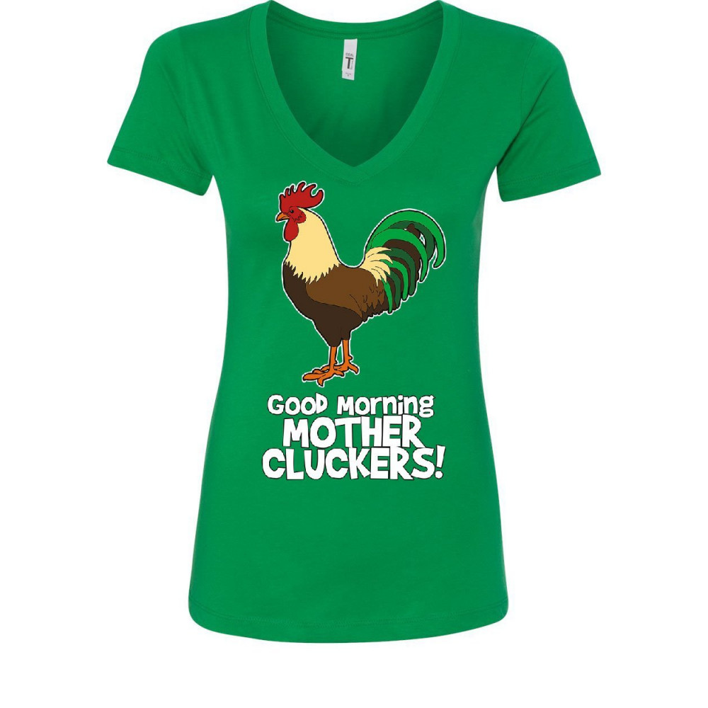 GOOD MORNING MOTHER CLUCKERS women's v-neck t-shirt funny adult humor rooster green