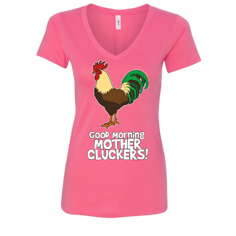 GOOD MORNING MOTHER CLUCKERS women's v-neck t-shirt funny adult humor rooster pink