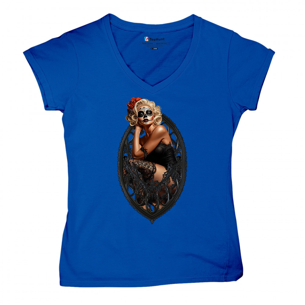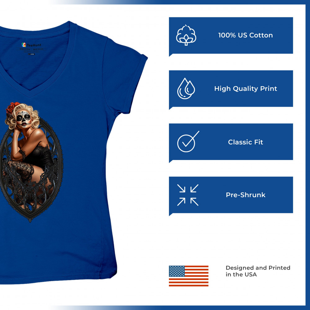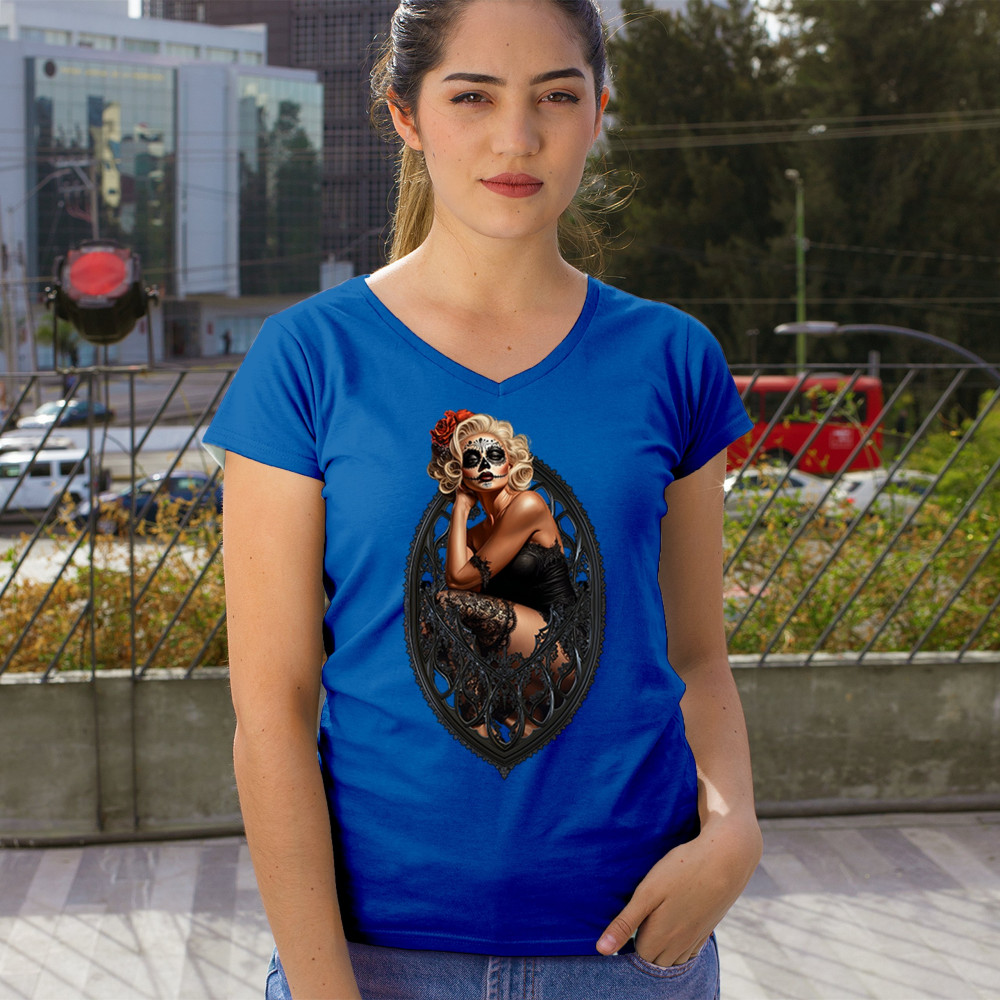 Sultry sugar skull pinup with gothic lace and ornate frame. Perfect for lovers of calavera fashion, dark romance, and vintage pinup style.