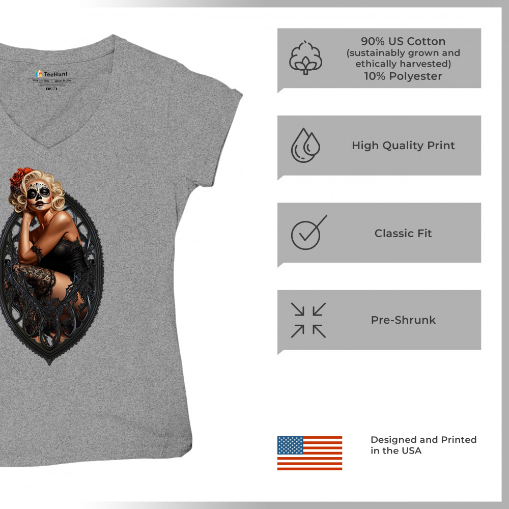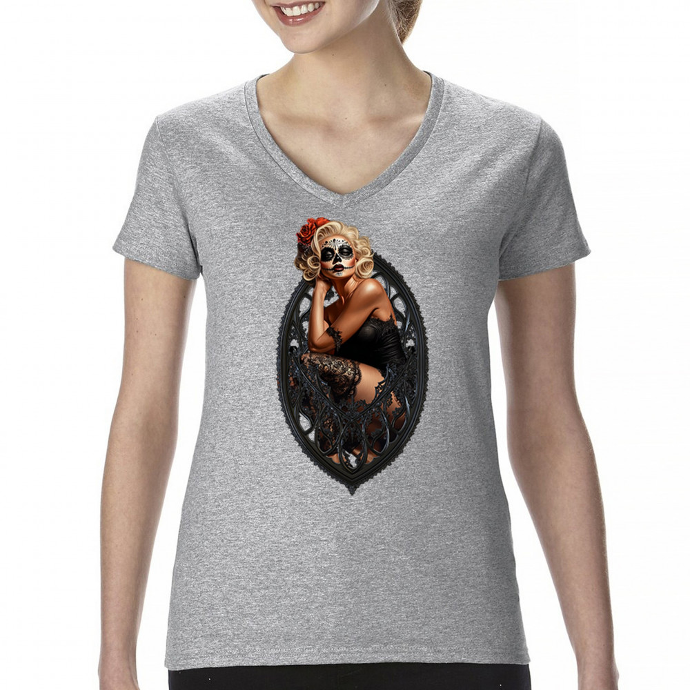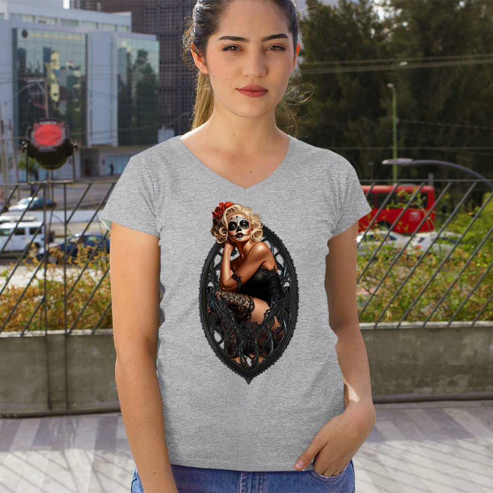 Sultry sugar skull pinup with gothic lace and ornate frame. Perfect for lovers of calavera fashion, dark romance, and vintage pinup style.
