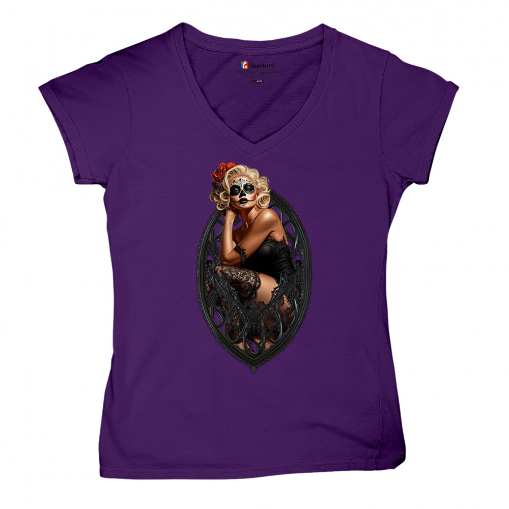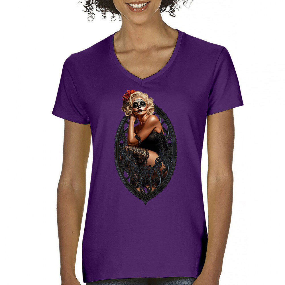 This sultry sugar skull pinup design blends gothic lace, seductive pose, and ornate frame detail for a bold Day of the Dead tribute. With striking makeup and vintage lingerie styling, it’s perfect for fans of macabre fashion, calavera art, and dark romance. A hauntingly beautiful mix of allure, attitude, and Dia de los Muertos charm.